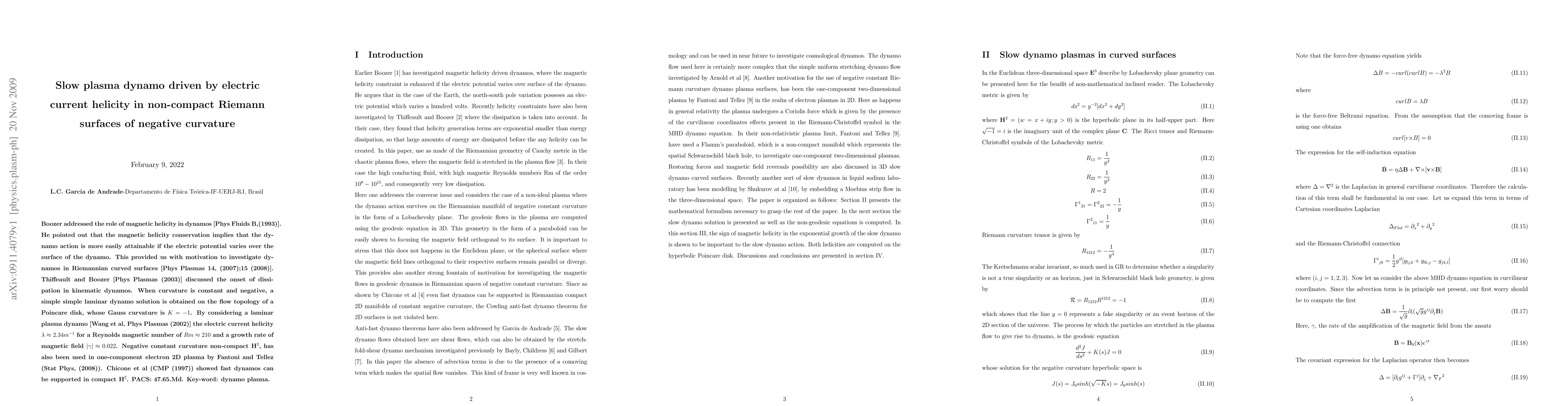 This paper explores the slow plasma dynamo driven by electric current helicity in non-compact Riemann surfaces with negative curvature, extending previous work on magnetic helicity in dynamos and the dynamics on curved surfaces. The study finds a laminar dynamo solution on the Poincare disk with constant negative curvature, demonstrating a growth rate of the magnetic field.