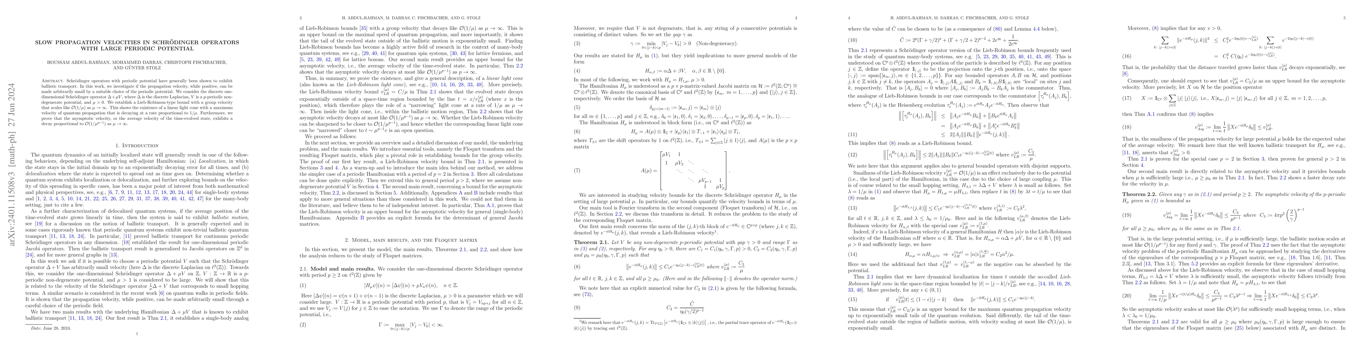 This paper demonstrates that the propagation velocity in one-dimensional Schrödinger operators with large periodic potentials can be made arbitrarily small. It establishes a Lieb-Robinson bound showing a group velocity scaling as $\mathcal{O}(1/\mu)$ and an asymptotic velocity decay of $\mathcal{O}(1/\mu^{p-1})$ as the potential strength increases.