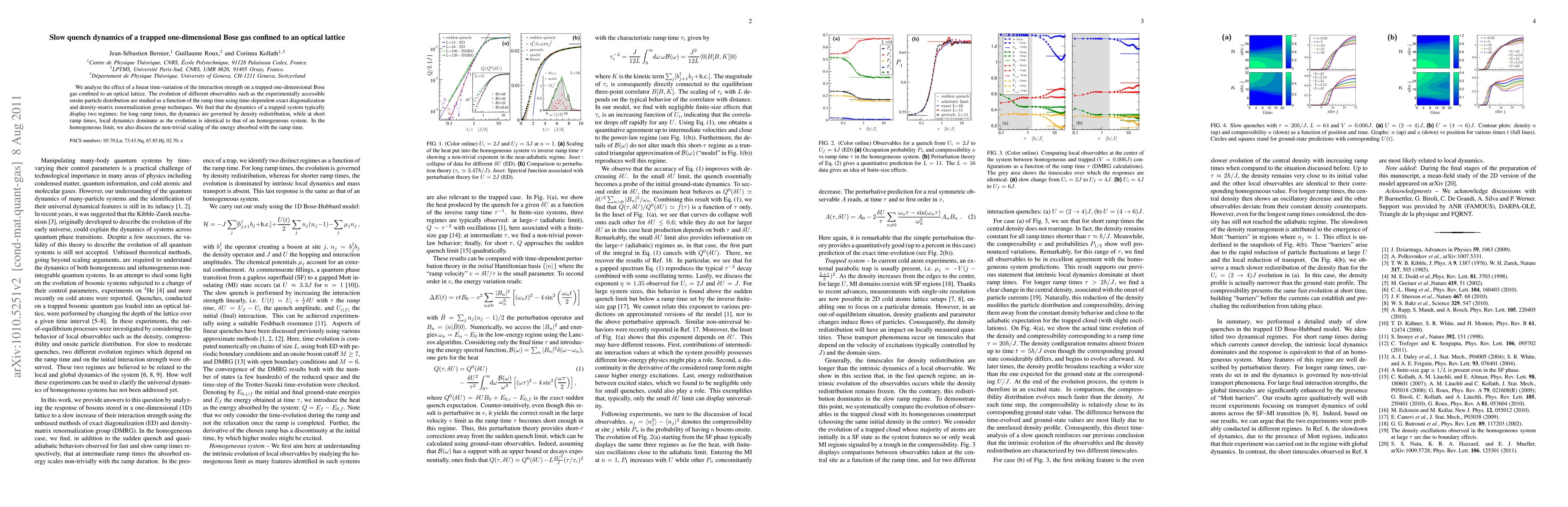 This paper investigates the slow quench dynamics of a one-dimensional Bose gas in an optical lattice under varying interaction strength. It reveals two distinct regimes: long ramp times lead to density redistribution, while short ramp times result in local dynamics similar to an homogeneous system, with a non-trivial scaling of absorbed energy with ramp time in the homogeneous limit.
