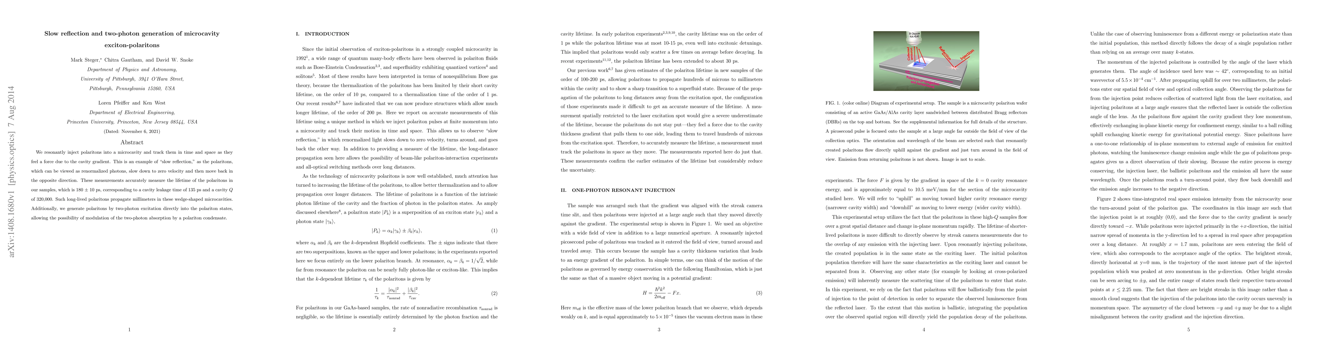 We resonantly inject polaritons into a microcavity and track them in time and space as they feel a force due to the cavity gradient. This is an example of "slow reflection," as the polaritons, which can be viewed as renormalized photons, slow down to zero velocity and then move back in the opposite direction. These measurements accurately measure the lifetime of the polaritons in our samples, which is 180 $\pm$ 10 ps, corresponding to a cavity leakage time of 135 ps and a cavity $Q$ of 320,000. Such long-lived polaritons propagate millimeters in these wedge-shaped microcavities. Additionally, we generate polaritons by two-photon excitation directly into the polariton states, allowing the possibility of modulation of the two-photon absorption by a polariton condensate.