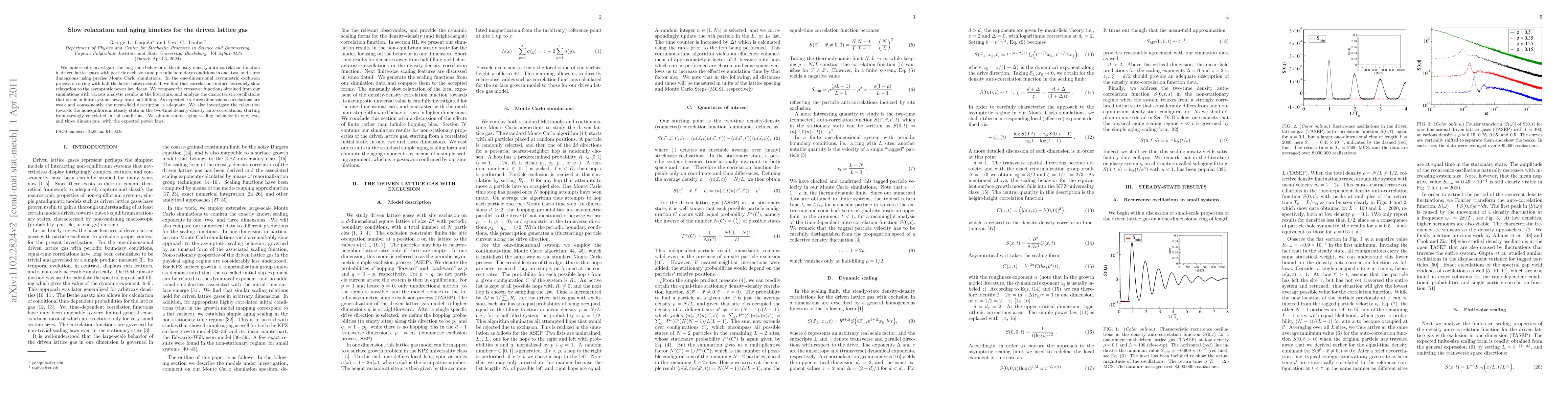 We numerically investigate the long-time behavior of the density-density auto-correlation function in driven lattice gases with particle exclusion and periodic boundary conditions in one, two, and three dimensions using precise Monte Carlo simulations. In the one-dimensional asymmetric exclusion process on a ring with half the lattice sites occupied, we find that correlations induce extremely slow relaxation to the asymptotic power law decay. We compare the crossover functions obtained from our simulations with various analytic results in the literature, and analyze the characteristic oscillations that occur in finite systems away from half-filling. As expected, in three dimensions correlations are weak and consequently the mean-field description is adequate. We also investigate the relaxation towards the nonequilibrium steady state in the two-time density-density auto-correlations, starting from strongly correlated initial conditions. We obtain simple aging scaling behavior in one, two, and three dimensions, with the expected power laws.