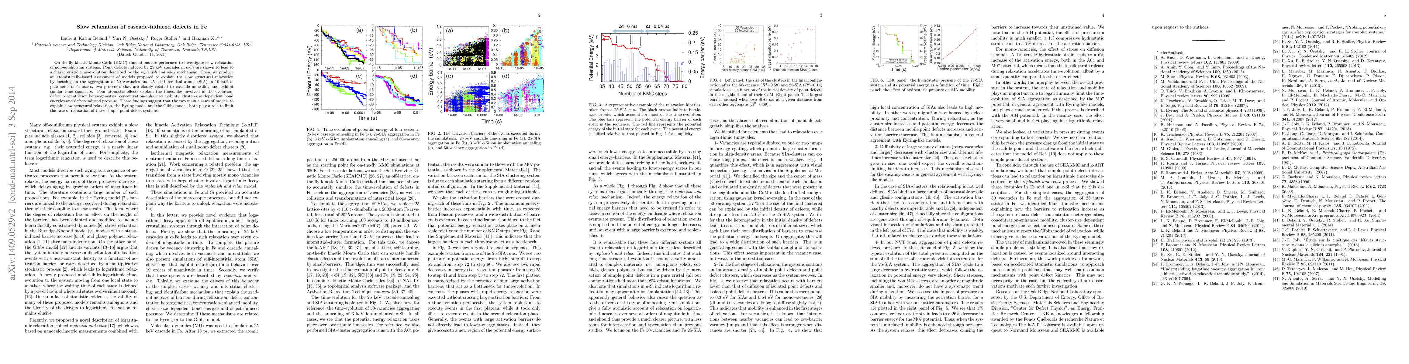 On-the-fly kinetic Monte Carlo (KMC) simulations are performed to investigate slow relaxation of non-equilibrium systems. Point defects induced by 25 keV cascades in $\alpha$-Fe are shown to lead to a characteristic time-evolution, described by the \emph{replenish and relax} mechanism. Then, we produce an atomistically-based assessment of models proposed to explain the slow structural relaxation by focusing on the aggregation of 50 vacancies and 25 self-interstital atoms (SIA) in 10-lattice-parameter $\alpha$-Fe boxes, two processes that are closely related to cascade annealing and exhibit similar time signature. Four atomistic effects explain the timescales involved in the evolution: defect concentration heterogeneities, concentration-enhanced mobility, cluster-size dependent bond energies and defect-induced pressure. These findings suggest that the two main classes of models to explain slow structural relaxation, the Eyring model and the Gibbs model, both play a role to limit the rate of relaxation of these simple point-defect systems.