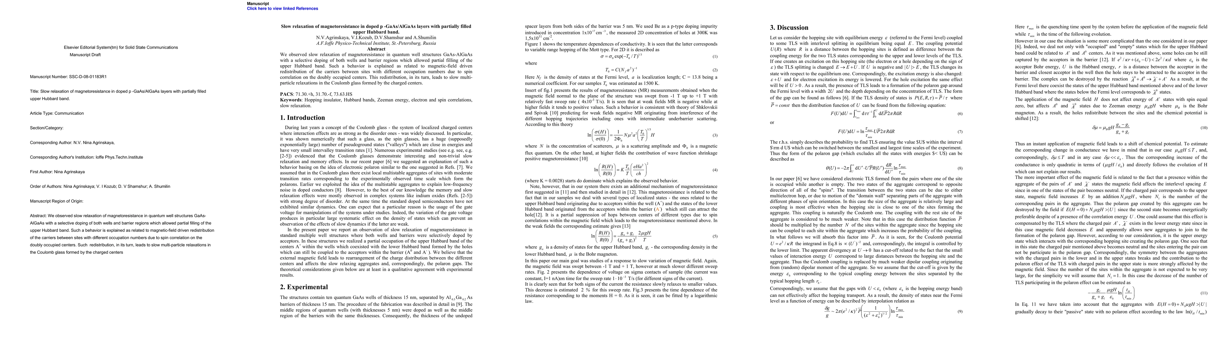 We observed slow relaxation of magnetoresistance in quantum well structures GaAs-AlGaAs with a selective doping of both wells and barrier regions which allowed partial filling of the upper Hubbard band. Such a behavior is explained as related to magnetic-field driven redistribution of the carriers between sites with different occupation numbers due to spin correlation on the doubly occupied centers. This redistribution, in its turn, leads to slow multi-particle relaxations in the Coulomb glass formed by the charged centers.