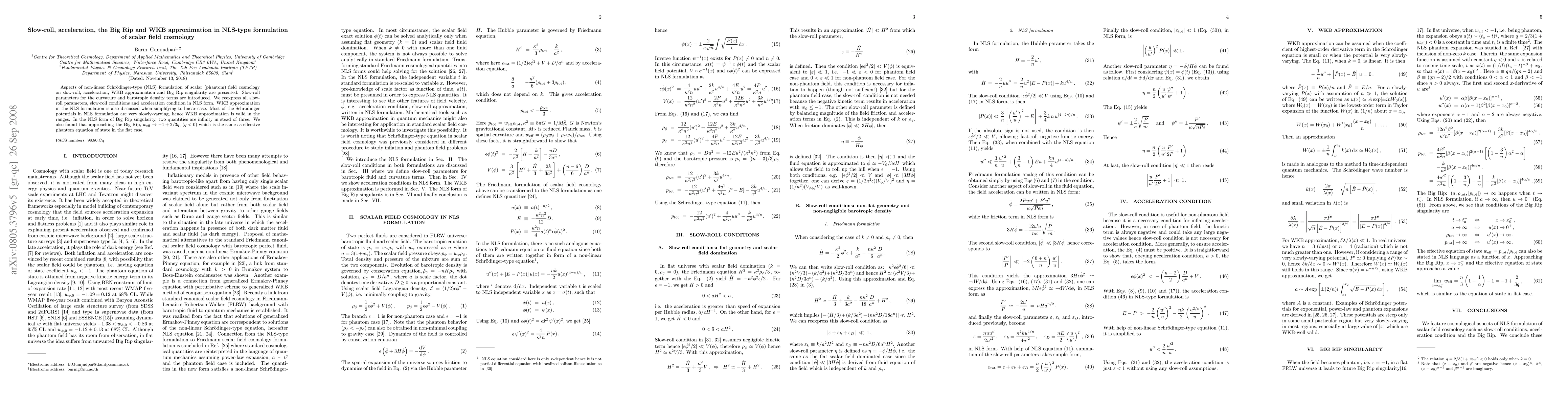 Aspects of non-linear Schr\"{o}dinger-type (NLS) formulation of scalar (phantom) field cosmology on slow-roll, acceleration, WKB approximation and Big Rip singularity are presented. Slow-roll parameters for the curvature and barotropic density terms are introduced. We reexpress all slow-roll parameters, slow-roll conditions and acceleration condition in NLS form. WKB approximation in the NLS formulation is also discussed when simplifying to linear case. Most of the Schr\"{o}dinger potentials in NLS formulation are very slowly-varying, hence WKB approximation is valid in the ranges. In the NLS form of Big Rip singularity, two quantities are infinity in stead of three. We also found that approaching the Big Rip, $w_{\rm eff}\to -1 + {2}/{3q}$, $(q<0)$ which is the same as effective phantom equation of state in the flat case.