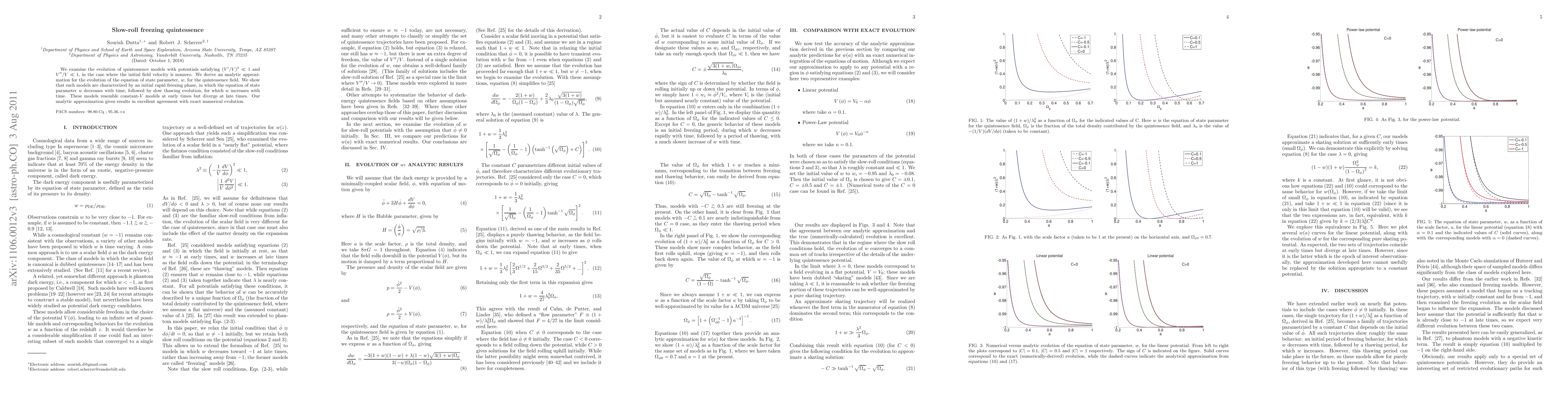 This paper studies quintessence models with slow-roll freezing, deriving an analytic approximation for the quintessence field's equation of state parameter. It shows an initial rapid freezing phase followed by slow thawing, resembling constant-V models early but diverging at late times, with excellent agreement between analytic and numerical results.