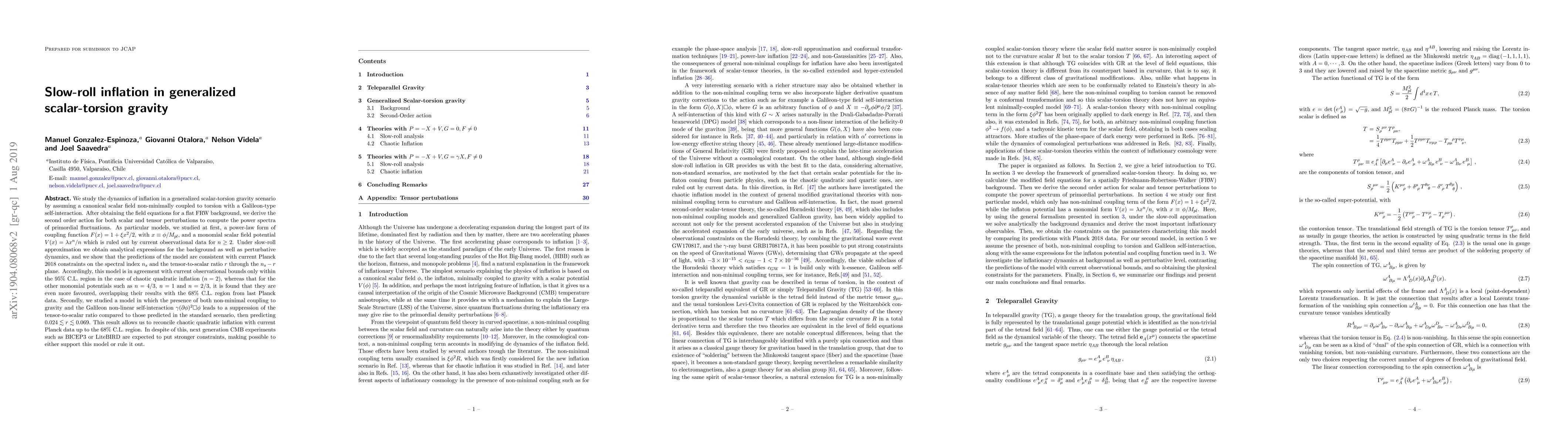 The paper presents a detailed analysis of slow-roll inflation in a generalized scalar-torsion gravity scenario, deriving analytical expressions for background dynamics and perturbations, and comparing predictions with observational data.