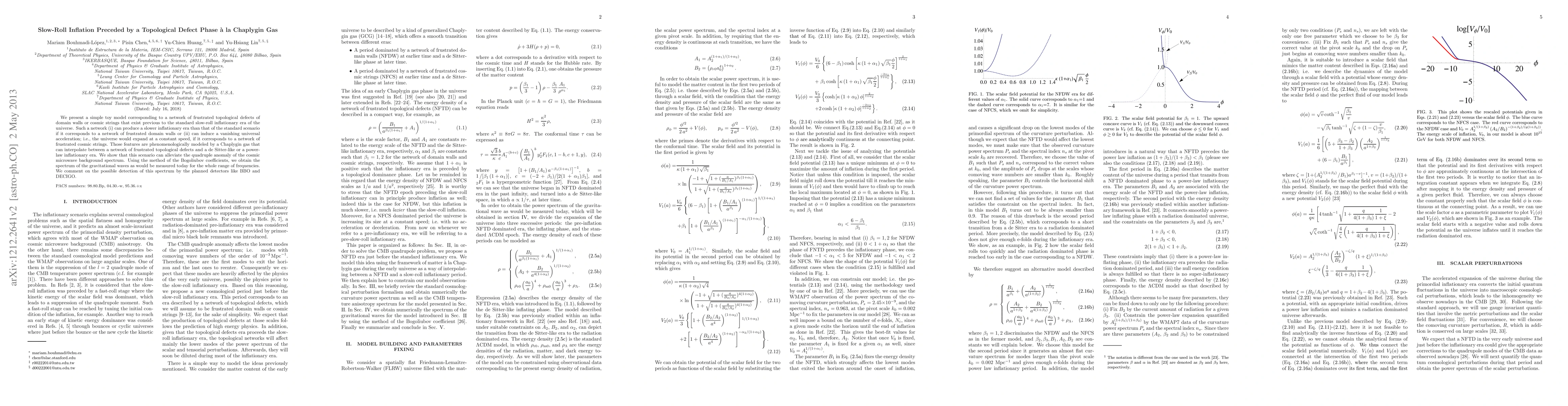 We present a simple toy model corresponding to a network of frustrated topological defects of domain walls or cosmic strings that exist previous to the standard slow-roll inflationary era of the universe. Such a network (i) can produce a slower inflationary era than that of the standard scenario if it corresponds to a network of frustrated domain walls or (ii) can induce a vanishing universal acceleration; i.e., the universe would expand at a constant speed, if it corresponds to a network of frustrated cosmic strings red. Those features are phenomenologically modeled by a Chaplygin gas that can interpolate between a network of frustrated topological defects and a de Sitter-like or a power-law inflationary era. We show that this scenario can alleviate the quadruple anomaly of the cosmic microwave background spectrum. Using the method of the Bogoliubov coefficients, we obtain the spectrum of the gravitational waves as would be measured today for the whole range of frequencies. We comment on the possible detection of this spectrum by the planned detectors like BBO and DECIGO.