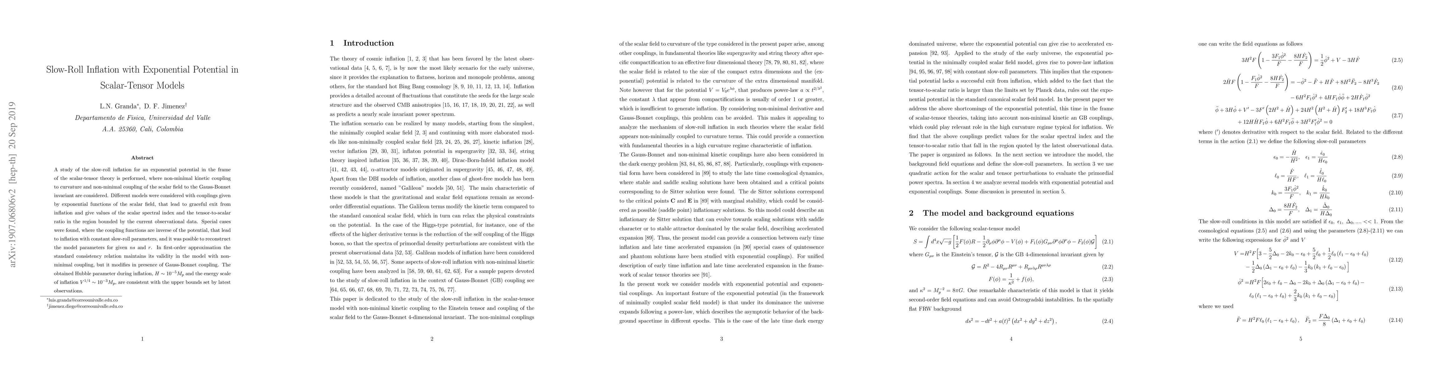 This paper explores slow-roll inflation within scalar-tensor models featuring exponential potentials, non-minimal kinetic coupling, and Gauss-Bonnet coupling. It finds models that gracefully exit inflation and align with observational data, while maintaining consistency relations in first-order approximation.