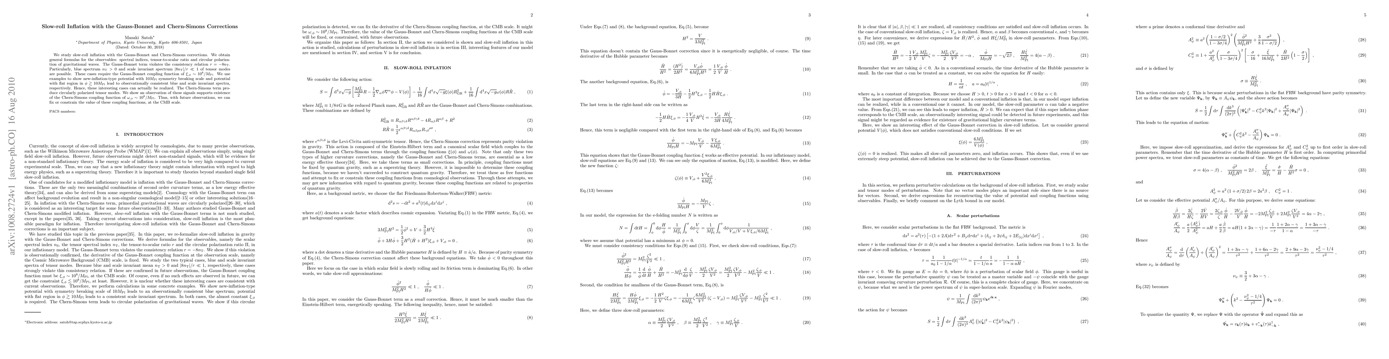 This paper investigates slow-roll inflation incorporating Gauss-Bonnet and Chern-Simons corrections, deriving formulas for spectral indices, tensor-to-scalar ratio, and gravitational wave polarization. The study finds that the Gauss-Bonnet term can produce blue spectra and scale-invariant spectra, while the Chern-Simons term generates circularly polarized tensor modes, potentially observable in future CMB data.