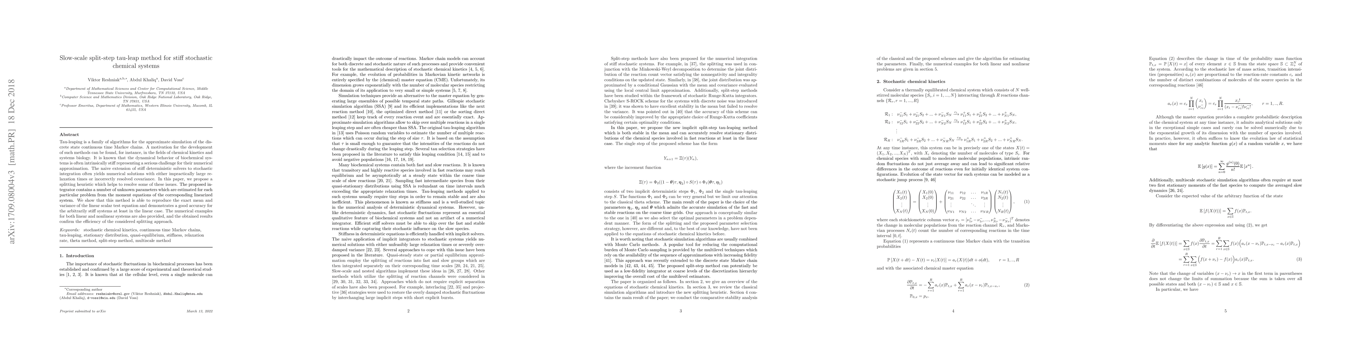 This paper proposes a novel method for simulating stiff stochastic chemical systems, overcoming issues with large relaxation times and covariance errors, achieving good accuracy in linear and nonlinear cases.