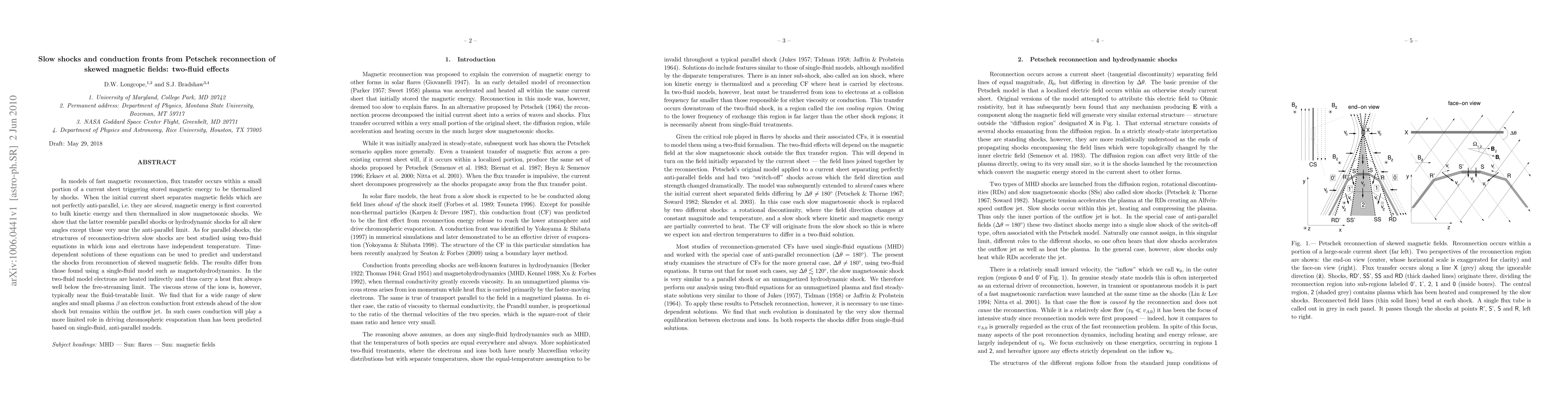 Researchers studied magnetic reconnection in skewed magnetic fields, finding that slow shocks resemble parallel shocks with independent ion and electron temperatures, leading to a more complex understanding of chromospheric evaporation.