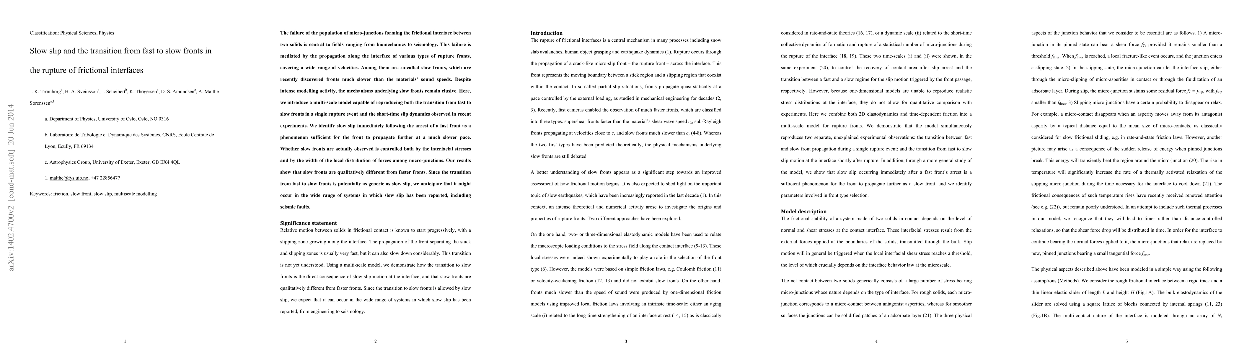 The failure of the population of micro-junctions forming the frictional interface between two solids is central to fields ranging from biomechanics to seismology. This failure is mediated by the propagation along the interface of various types of rupture fronts, covering a wide range of velocities. Among them are so-called slow fronts, which are recently discovered fronts much slower than the materials' sound speeds. Despite intense modelling activity, the mechanisms underlying slow fronts remain elusive. Here, we introduce a multi-scale model capable of reproducing both the transition from fast to slow fronts in a single rupture event and the short-time slip dynamics observed in recent experiments. We identify slow slip immediately following the arrest of a fast front as a phenomenon sufficient for the front to propagate further at a much slower pace. Whether slow fronts are actually observed is controlled both by the interfacial stresses and by the width of the local distribution of forces among micro-junctions. Our results show that slow fronts are qualitatively different from faster fronts. Since the transition from fast to slow fronts is potentially as generic as slow slip, we anticipate that it might occur in the wide range of systems in which slow slip has been reported, including seismic faults.