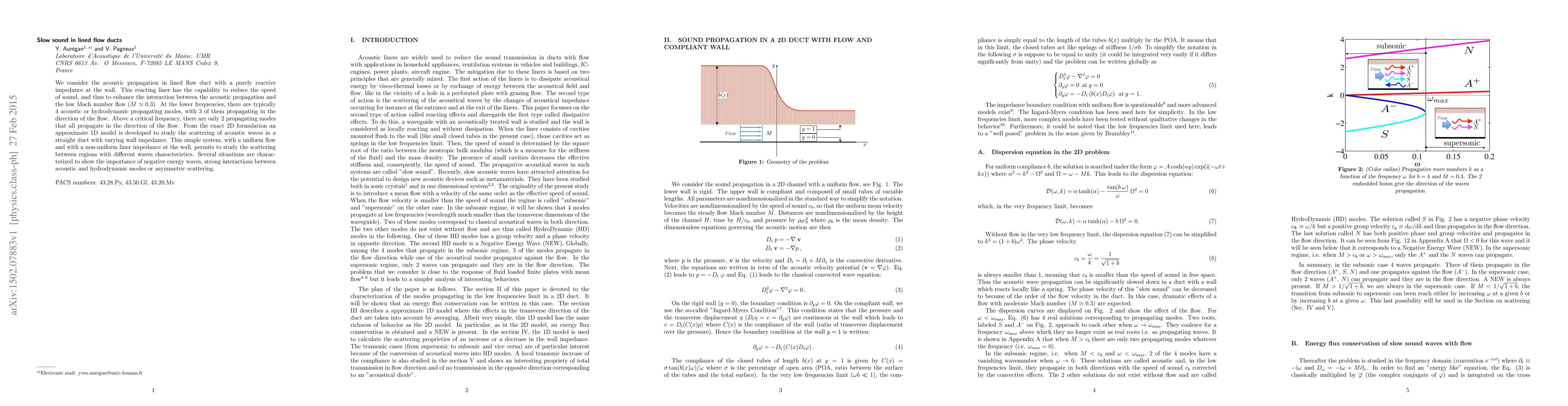 We consider the acoustic propagation in lined flow duct with a purely reactive impedance at the wall. This reacting liner has the capability to reduce the speed of sound, and thus to enhance the interaction between the acoustic propagation and the low Mach number flow ($M\simeq0.3$). At the lower frequencies, there are typically 4 acoustic or hydrodynamic propagating modes, with 3 of them propagating in the direction of the flow. Above a critical frequency, there are only 2 propagating modes that all propagate in the direction of the flow. From the exact 2D formulation an approximate 1D model is developed to study the scattering of acoustic waves in a straight duct with varying wall impedance. This simple system, with a uniform flow and with a non-uniform liner impedance at the wall, permits to study the scattering between regions with different waves characteristics. Several situations are characterized to show the importance of negative energy waves, strong interactions between acoustic and hydrodynamic modes or asymmetric scattering.