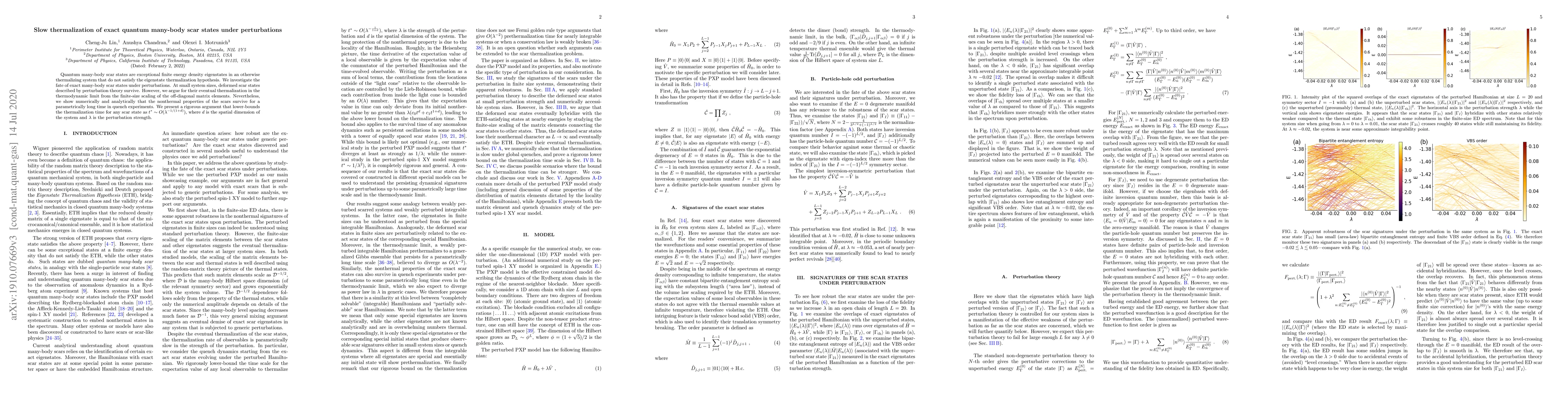 This paper investigates the thermalization behavior of exact quantum many-body scar states under perturbations, finding that while they eventually thermalize in the thermodynamic limit, they exhibit slow thermalization characterized by a time scale $t^{*} \sim O(\lambda^{-1/(1+d)})$, where $d$ is the spatial dimension and $\lambda$ is the perturbation strength.