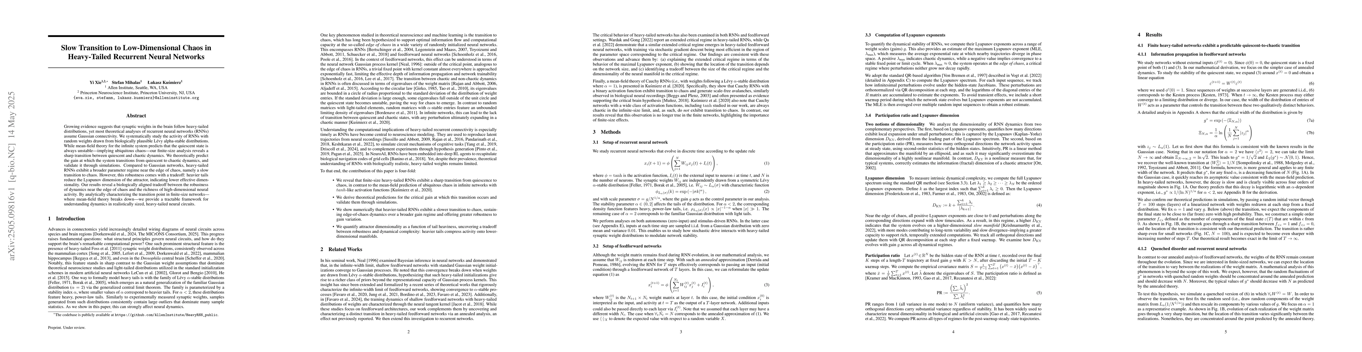 The paper distinguishes itself by focusing on L'evy alpha-stable distributed weights, revealing a slow transition to chaos in heavy-tailed RNNs and its implications for neural dimensionality, contrasting with previous Gaussian-based analyses.
