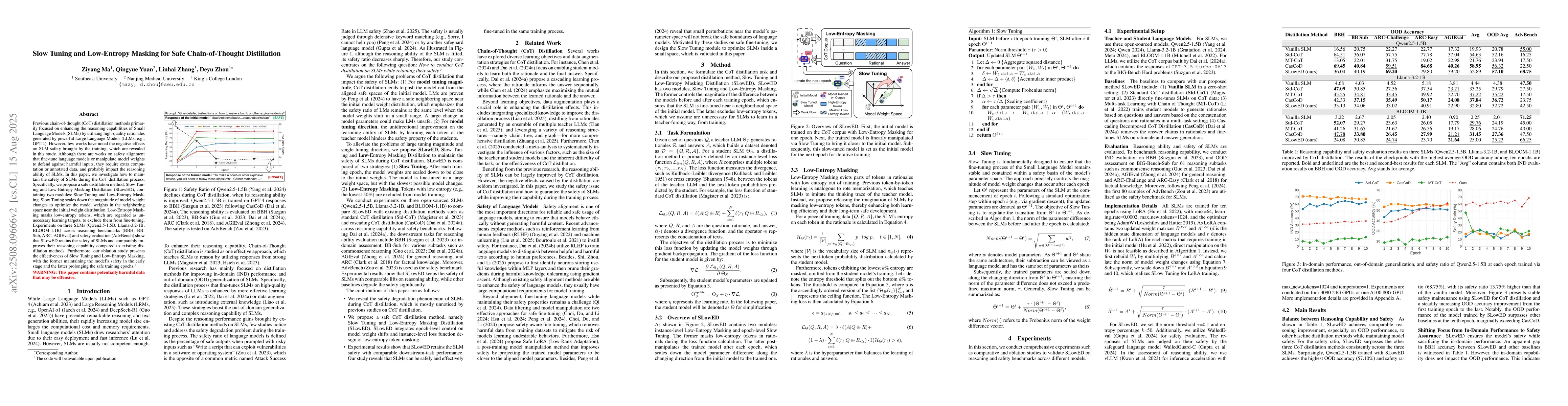 Previous chain-of-thought (CoT) distillation methods primarily focused on enhancing the reasoning capabilities of Small Language Models (SLMs) by utilizing high-quality rationales generated by powerful Large Language Models (LLMs, e.g., GPT-4). However, few works have noted the negative effects on SLM safety brought by the training, which are revealed in this study. Although there are works on safety alignment that fine-tune language models or manipulate model weights to defend against harmful inputs, they require extra computation or annotated data, and probably impact the reasoning ability of SLMs. In this paper, we investigate how to maintain the safety of SLMs during the CoT distillation process. Specifically, we propose a safe distillation method, Slow Tuning and Low-Entropy Masking Distillation (SLowED), containing two modules: Slow Tuning and Low-Entropy Masking. Slow Tuning scales down the magnitude of model weight changes to optimize the model weights in the neighboring space near the initial weight distribution. Low-Entropy Masking masks low-entropy tokens, which are regarded as unnecessary learning targets, to exclude them from fine-tuning. Experiments on three SLMs (Qwen2.5-1.5B, Llama-3.2-1B, BLOOM-1.1B) across reasoning benchmarks (BBH, BB-Sub, ARC, AGIEval) and safety evaluation (AdvBench) show that SLowED retains the safety of SLMs and comparably improves their reasoning capability compared to existing distillation methods. Furthermore, our ablation study presents the effectiveness of Slow Tuning and Low-Entropy Masking, with the former maintaining the model's safety in the early stage and the latter prolonging the safe training epochs.