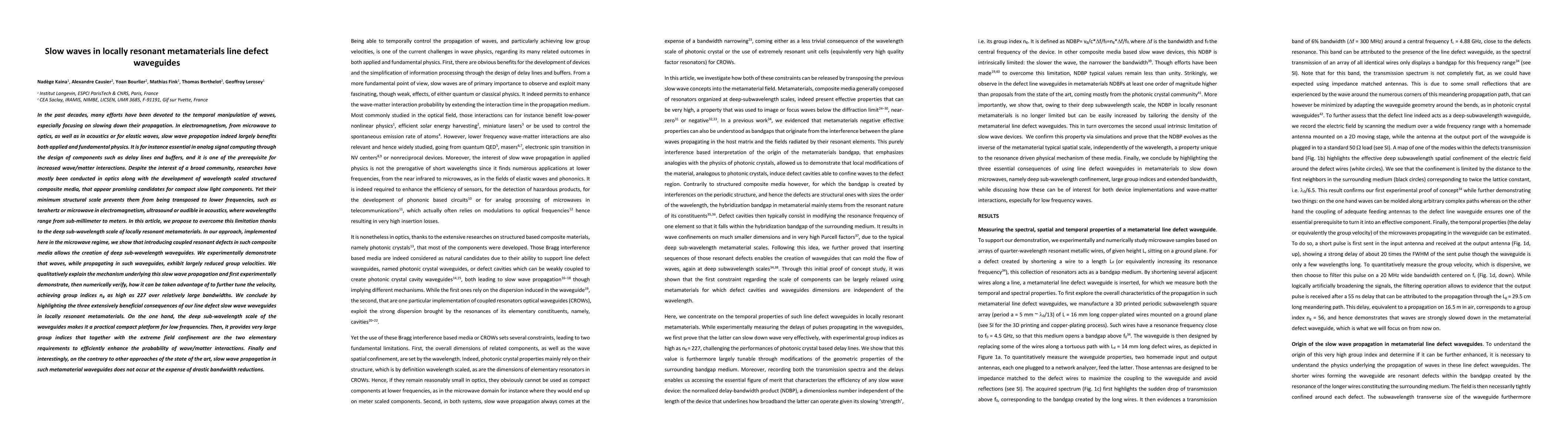 This paper proposes a method to slow down wave propagation using locally resonant metamaterials with coupled resonant defects, demonstrating significant reduction in group velocities in microwave waveguides. The approach achieves high group indices up to 227 without severe bandwidth reductions, offering potential benefits for signal computing and wave/matter interactions.