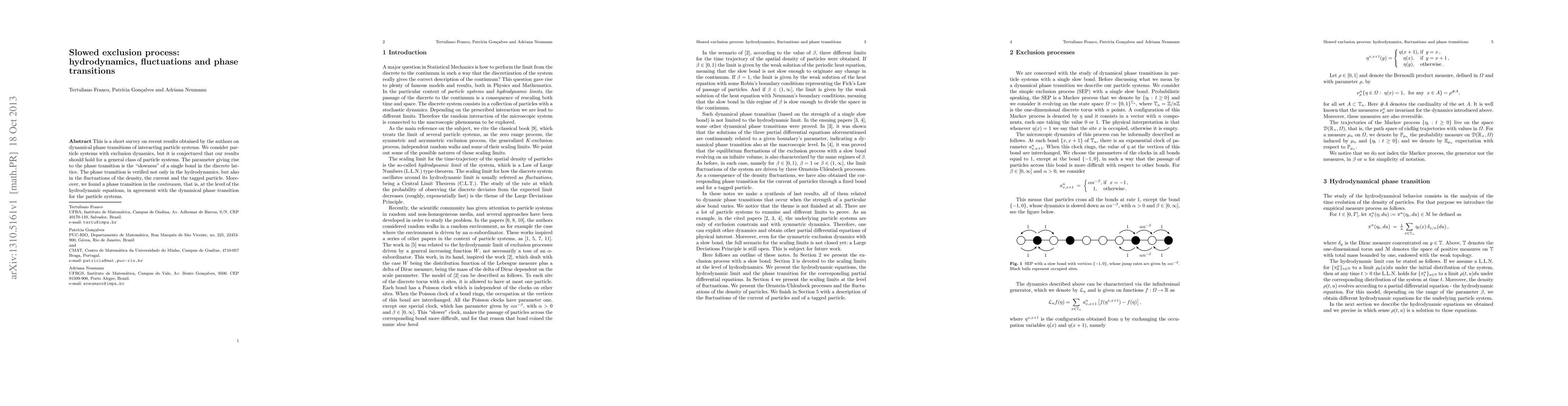 This is a short survey on recent results obtained by the authors on dynamical phase transitions of interacting particle systems. We consider particle systems with exclusion dynamics, but it is conjectured that our results should hold for a general class of particle systems. The parameter giving rise to the phase transition is the "slowness" of a single bond in the discrete lattice. The phase transition is verified not only in the hydrodynamics, but also in the fluctuations of the density, the current and the tagged particle. Moreover, we found a phase transition in the continuum, that is, at the level of the hydrodynamic equations, in agreement with the dynamical phase transition for the particle systems.