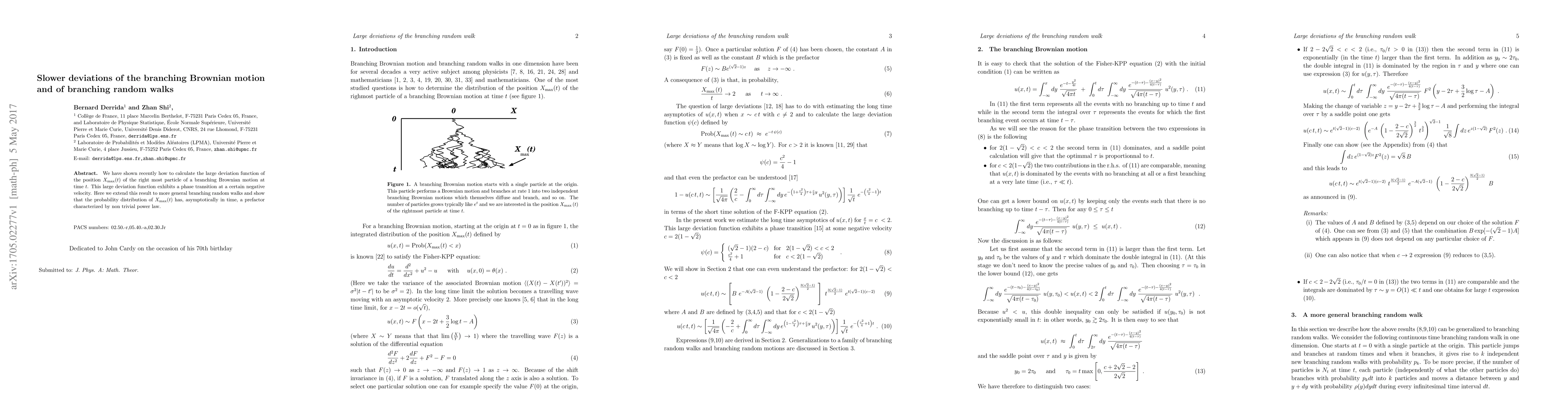 This paper extends the calculation of the large deviation function for the rightmost particle in branching Brownian motion to branching random walks, revealing a phase transition and a nontrivial power-law prefactor in the probability distribution of the maximum position $X_{\max}(t)$ over time.