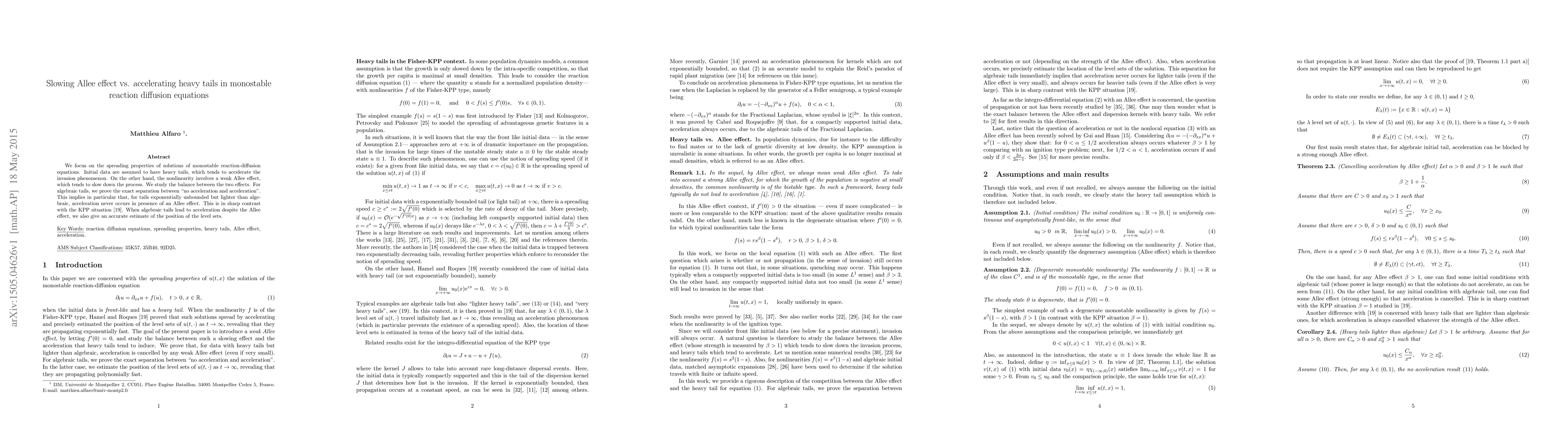 We focus on the spreading properties of solutions of monostable reaction-diffusion equations. Initial data are assumed to have heavy tails, which tends to accelerate the invasion phenomenon. On the other hand, the nonlinearity involves a weak Allee effect, which tends to slow down the process. We study the balance between the two effects. For algebraic tails, we prove the exact separation between "no acceleration and acceleration". This implies in particular that, for tails exponentially unbounded but lighter than algebraic , acceleration never occurs in presence of an Allee effect. This is in sharp contrast with the KPP situation [19]. When algebraic tails lead to acceleration despite the Allee effect, we also give an accurate estimate of the position of the level sets.