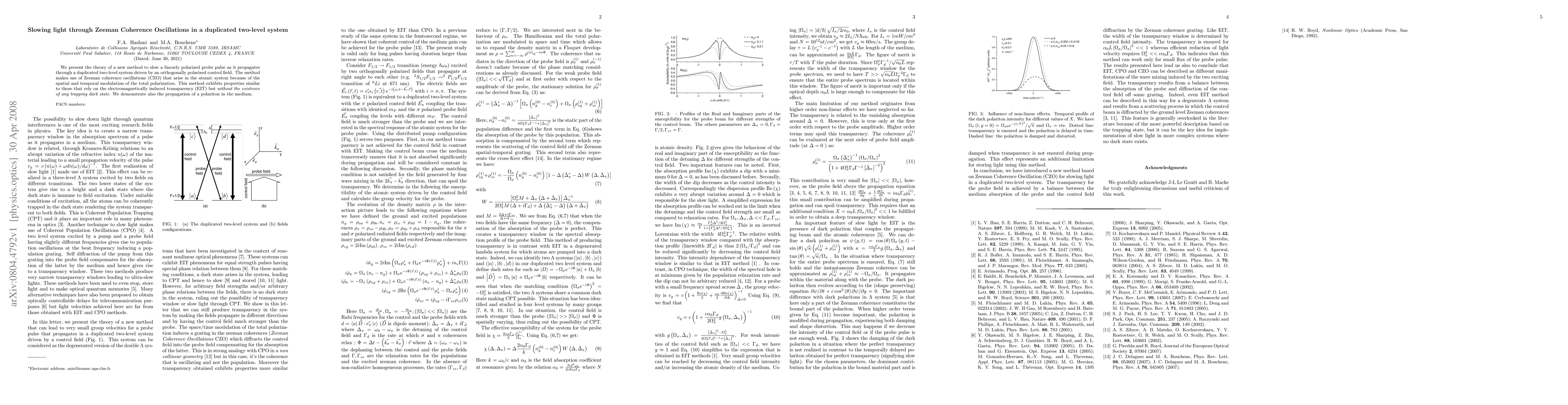 This paper proposes a novel method for slowing light using Zeeman coherence oscillations in a duplicated two-level atomic system driven by an orthogonal control field, achieving similar effects to electromagnetically induced transparency without trapping states, and demonstrates the propagation of a dark polariton.