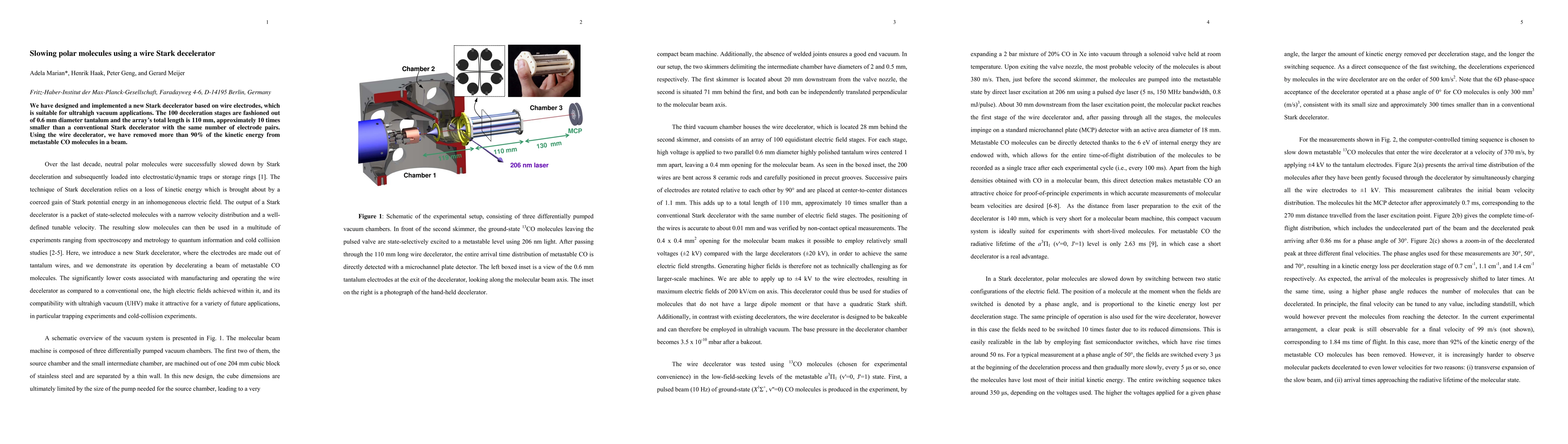 This research paper details the design and implementation of a compact wire Stark decelerator, significantly smaller than conventional models, which successfully decelerates polar molecules by over 90% using 100 stages of 0.6 mm tantalum wire electrodes in an ultrahigh vacuum environment.