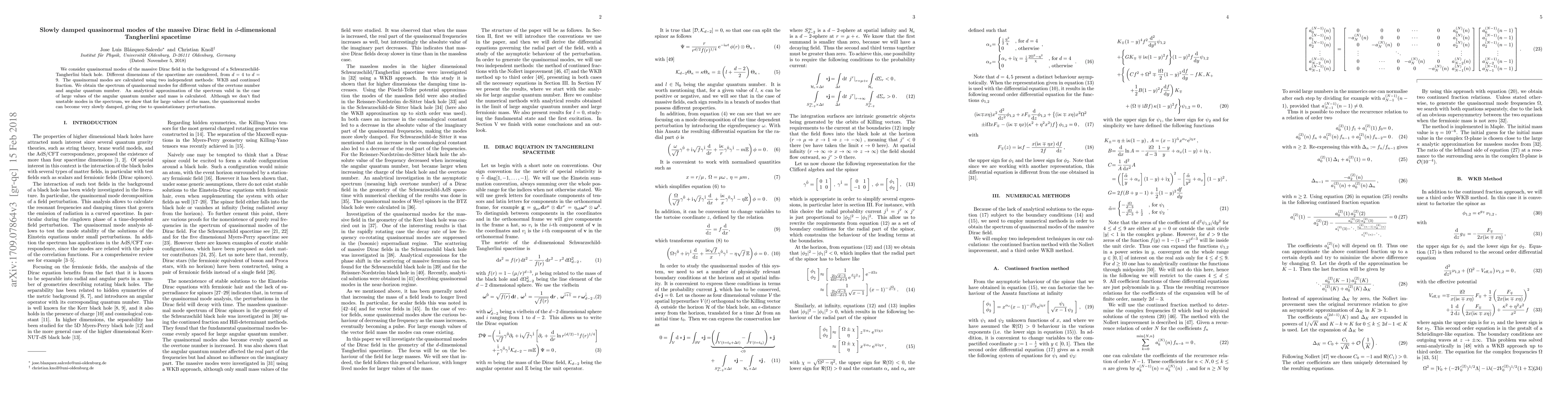 We consider quasinormal modes of the massive Dirac field in the background of a Schwarzschild- Tangherlini black hole. Different dimensions of the spacetime are considered, from d = 4 to d = 9. The quasinormal modes are calculated using two independent methods: WKB and continued fraction. We obtain the spectrum of quasinormal modes for different values of the overtone number and angular quantum number. An analytical approximation of the spectrum valid in the case of large values of the angular quantum number and mass is calculated. Although we don't find unstable modes in the spectrum, we show that for large values of the mass, the quasinormal modes can become very slowly damped, giving rise to quasistationary perturbations.