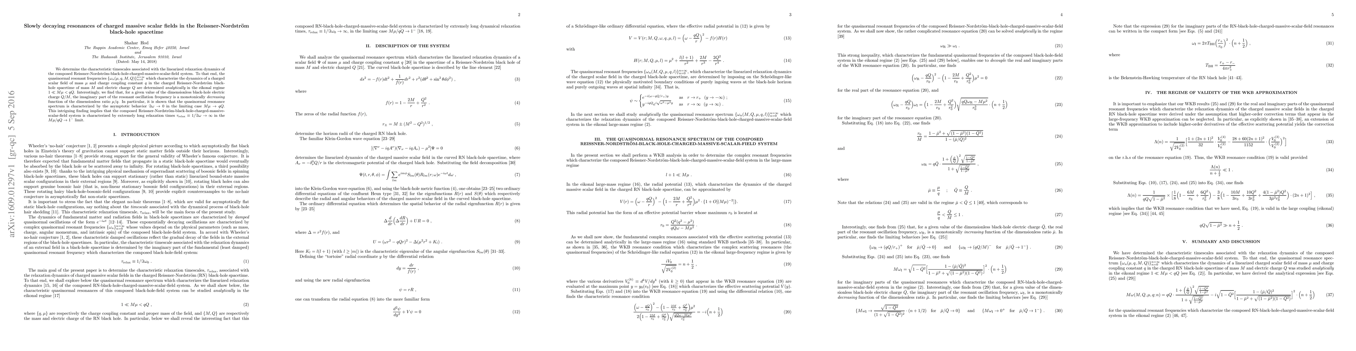 This paper analytically determines the quasinormal resonant frequencies for a charged massive scalar field in a Reissner-Nordström black hole spacetime, revealing that the imaginary part of the resonant frequency decreases with the ratio of mass to charge, leading to extremely long relaxation times as the mass and charge approach equality.