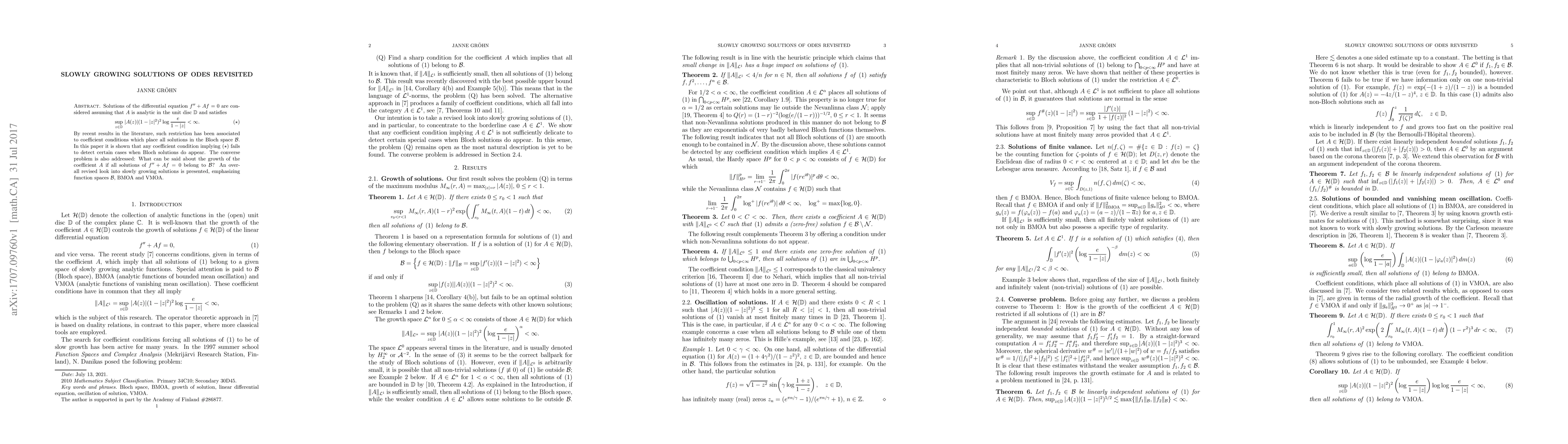 Solutions of the differential equation $f''+Af=0$ are considered assuming that $A$ is analytic in the unit disc $\mathbb{D}$ and satisfies \begin{equation} \label{eq:dag} \sup_{z\in\mathbb{D}} \, |A(z)| (1-|z|^2)^2 \log\frac{e}{1-|z|} < \infty. \tag{$\star$} \end{equation} By recent results in the literature, such restriction has been associated to coefficient conditions which place all solutions in the Bloch space $\mathcal{B}$. In this paper it is shown that any coefficient condition implying \eqref{eq:dag} fails to detect certain cases when Bloch solutions do appear. The converse problem is also addressed: What can be said about the growth of the coefficient $A$ if all solutions of $f''+Af=0$ belong to $\mathcal{B}$? An overall revised look into slowly growing solutions is presented, emphasizing function spaces $\mathcal{B}$, $\rm{BMOA}$ and $\rm{VMOA}$.
