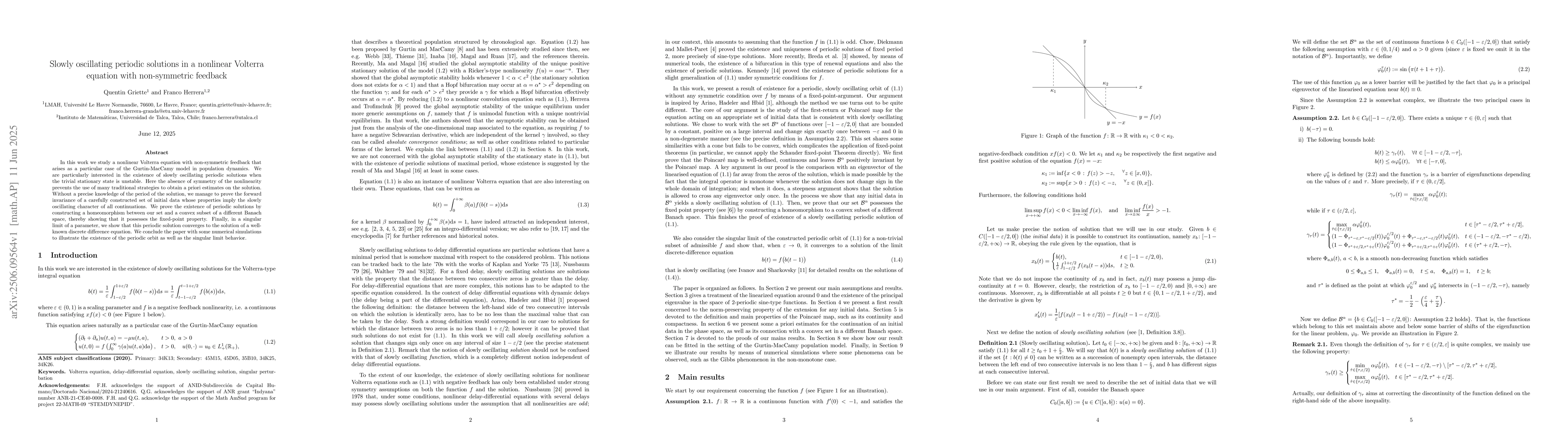 In this work we study a nonlinear Volterra equation with non-symmetric feedback that arises as a particular case of the Gurtin-MacCamy model in population dynamics. We are particularly interested in the existence of slowly oscillating periodic solutions when the trivial stationary state is unstable. Here the absence of symmetry of the nonlinearity prevents the use of many traditional strategies to obtain a priori estimates on the solution. Without a precise knowledge of the period of the solution, we manage to prove the forward invariance of a carefully constructed set of initial data whose properties imply the slowly oscillating character of all continuations. We prove the existence of periodic solutions by constructing a homeomorphism between our set and a convex subset of a different Banach space, thereby showing that it possesses the fixed-point property. Finally, in a singular limit of a parameter, we show that this periodic solution converges to the solution of a wellknown discrete difference equation. We conclude the paper with some numerical simulations to illustrate the existence of the periodic orbit as well as the singular limit behavior.