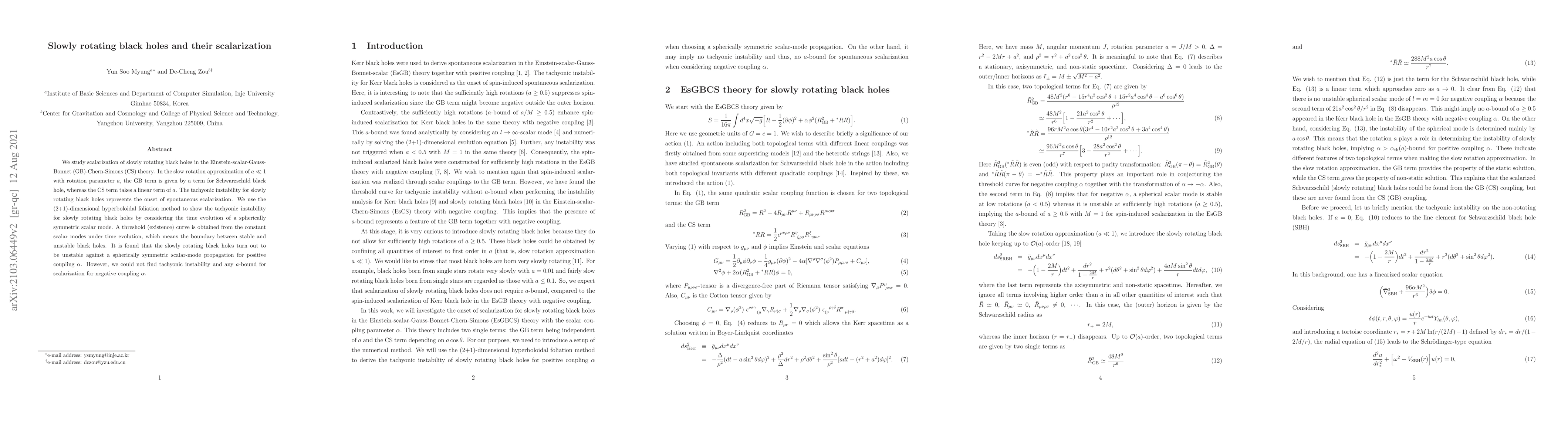 We study scalarization of slowly rotating black holes in the Einstein-scalar-Gauss-Bonnet (GB)-Chern-Simons (CS) theory. In the slow rotation approximation of $a\ll1$ with rotation parameter $a$, the GB term is given by a term for Schwarzschild black hole, whereas the CS term takes a linear term of $a$. The tachyonic instability for slowly rotating black holes represents the onset of spontaneous scalarization. We use the (2+1)-dimensional hyperboloidal foliation method to show the tachyonic instability for slowly rotating black holes by considering the time evolution of a spherically symmetric scalar mode. A threshold (existence) curve is obtained from the constant scalar modes under time evolution, which means the boundary between stable and unstable black holes. It is found that the slowly rotating black holes turn out to be unstable against a spherically symmetric scalar-mode propagation for positive coupling $\alpha$. However, we could not find tachyonic instability and any $a$-bound for scalarization for negative coupling $\alpha$.