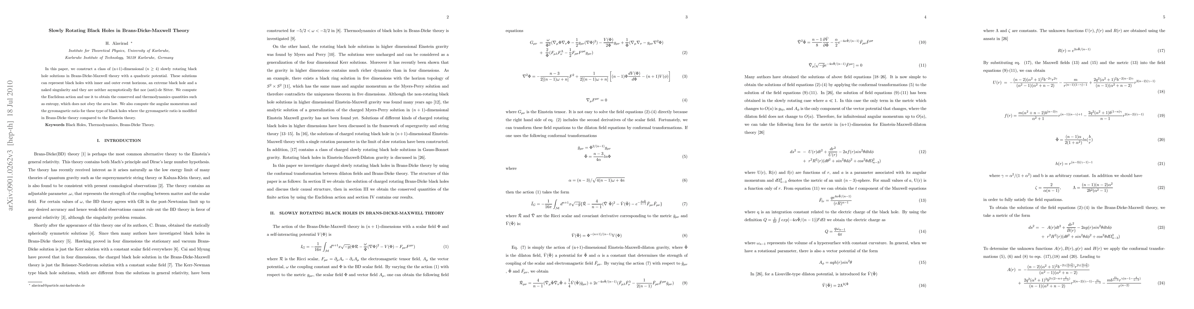 This paper constructs (n+1)-dimensional slowly rotating black hole solutions in Brans-Dicke-Maxwell theory with a quadratic potential, exploring various types of black holes and singularities. It computes the Euclidean action to derive conserved and thermodynamic quantities, finding that entropy does not follow the area law and that the gyromagnetic ratio is modified in Brans-Dicke theory.