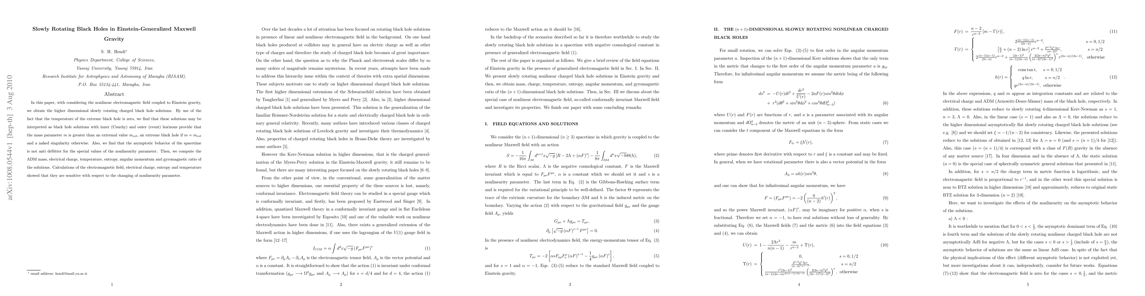 This paper derives higher dimensional slowly rotating charged black hole solutions in Einstein-Generalized Maxwell Gravity, finding that these solutions can represent black holes with inner and outer horizons if mass parameter exceeds a certain threshold, or naked singularities otherwise. The study reveals that asymptotic behavior isn't anti-deSitter for specific nonlinearity parameter values. Key findings include the sensitivity of electromagnetic field, charge, entropy, and temperature to changes in the nonlinearity parameter, with computations of ADM mass, charge, temperature, entropy, angular momentum, and gyromagnetic ratio provided.