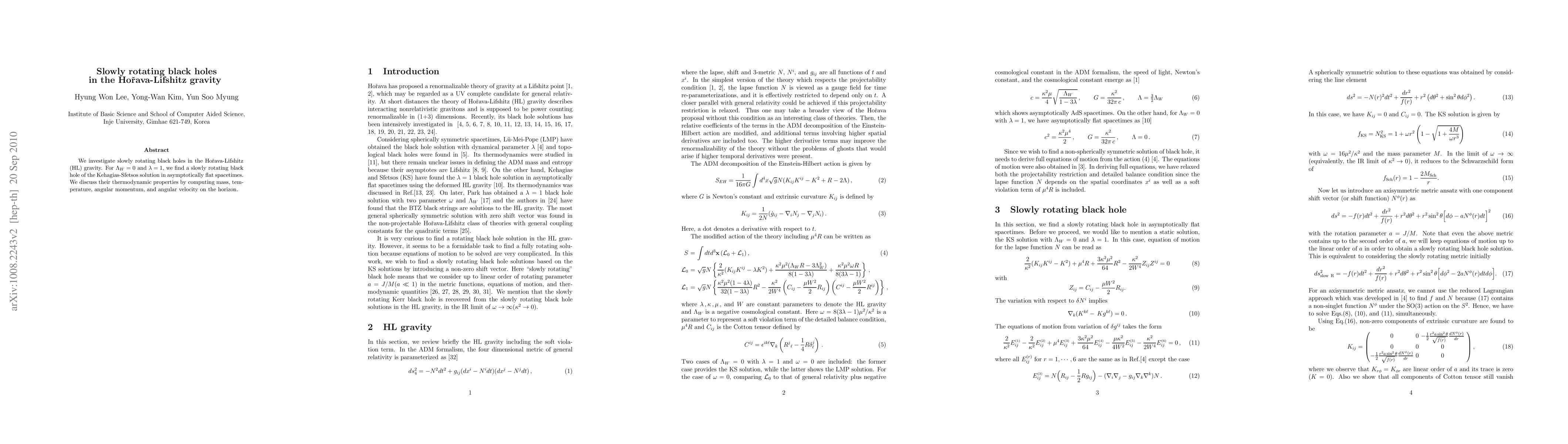 This paper explores slowly rotating black holes within the framework of Ho\v{r}ava-Lifshitz gravity, specifically focusing on the Kehagias-Sfetsos solution under certain theoretical conditions. It examines the thermodynamic characteristics, including mass, temperature, angular momentum, and angular velocity of the horizon.