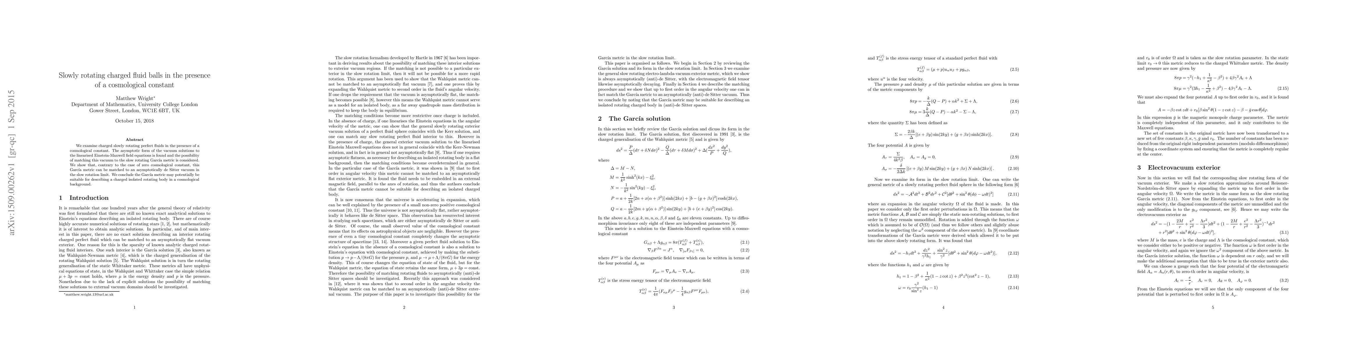 This paper investigates charged, slowly rotating perfect fluids with a cosmological constant, finding that the Garc\'ia metric can be matched to an asymptotically de Sitter vacuum, unlike scenarios without a cosmological constant. This suggests the Garc\'ia metric may describe a charged, isolated rotating body in a cosmological context.