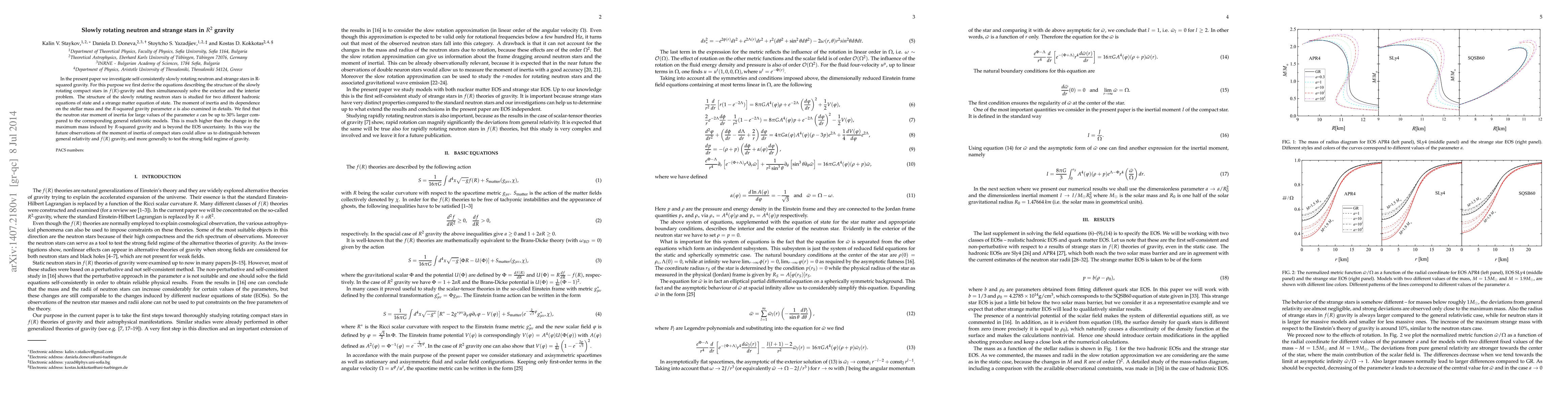In the present paper we investigate self-consistently slowly rotating neutron and strange stars in R-squared gravity. For this purpose we first derive the equations describing the structure of the slowly rotating compact stars in $f(R)$-gravity and then simultaneously solve the exterior and the interior problem. The structure of the slowly rotating neutron stars is studied for two different hadronic equations of state and a strange matter equation of state. The moment of inertia and its dependence on the stellar mass and the $R$-squared gravity parameter $a$ is also examined in details. We find that the neutron star moment of inertia for large values of the parameter $a$ can be up to $30\%$ larger compared to the corresponding general relativistic models. This is much higher than the change in the maximum mass induced by $R$-squared gravity and is beyond the EOS uncertainty. In this way the future observations of the moment of inertia of compact stars could allow us to distinguish between general relativity and $f(R)$ gravity, and more generally to test the strong field regime of gravity.
