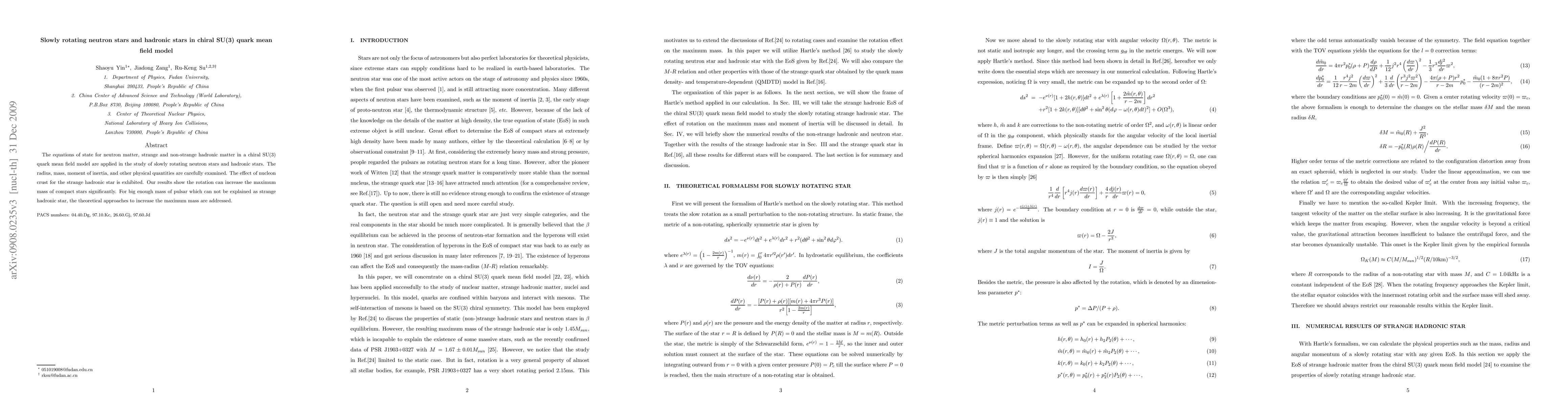 This paper investigates the equations of state for neutron and hadronic matter using a chiral SU(3) quark mean field model to study slowly rotating neutron and hadronic stars. The study finds that rotation can significantly increase the maximum mass of these compact stars, and explores theoretical approaches to account for pulsars that exceed the mass limits of strange hadronic stars.