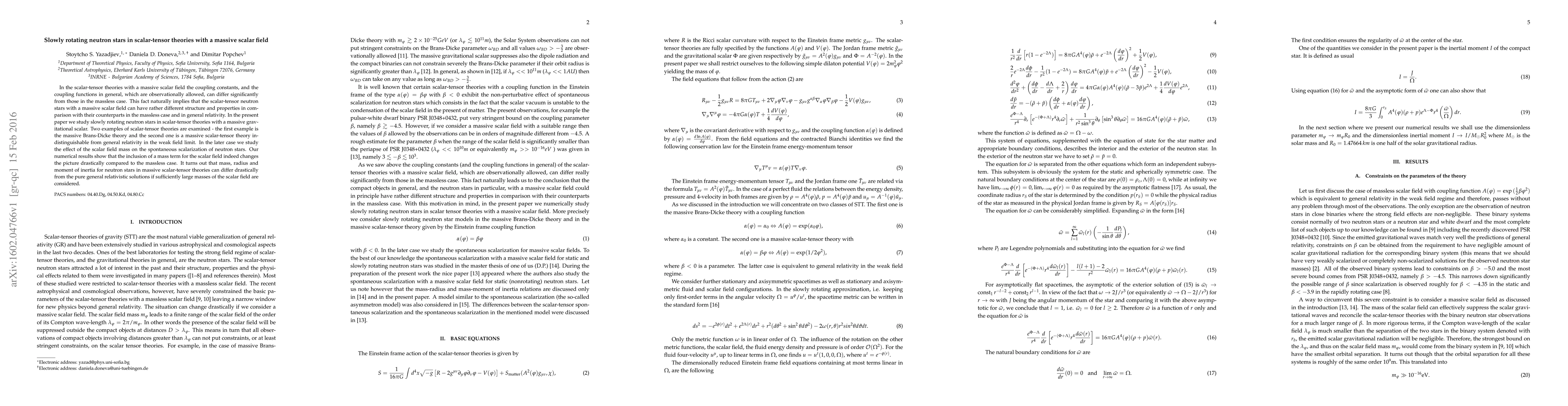 This paper investigates the structure and properties of slowly rotating neutron stars in scalar-tensor theories with a massive scalar field, finding that the inclusion of a scalar field mass significantly alters their mass, radius, and moment of inertia compared to general relativity. The study compares massive Brans-Dicke theory and a massive scalar-tensor theory, highlighting drastic differences for large scalar field masses.