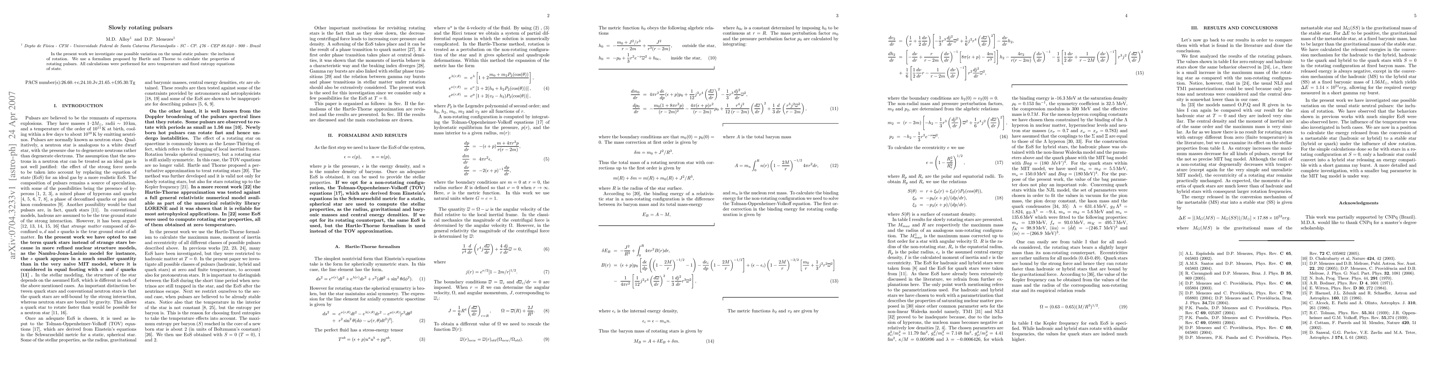 Researchers studied rotating pulsars using a formalism proposed by Hartle and Thorne, calculating properties for various compositions under zero temperature and fixed entropy equations of state.
