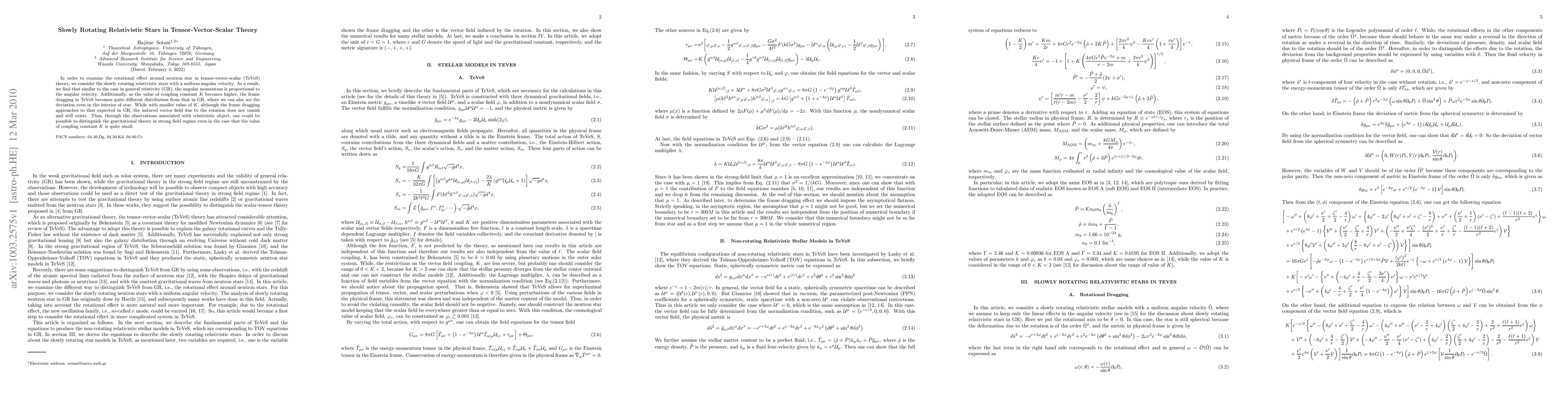 In order to examine the rotational effect around neutron star in tensor-vector-scalar (TeVeS) theory, we consider the slowly rotating relativistic stars with a uniform angular velocity. As a result, we find that similar to the case in general relativity (GR), the angular momentum is proportional to the angular velocity. Additionally, as the value of coupling constant $K$ becomes higher, the frame dragging in TeVeS becomes quite different distribution from that in GR, where we can also see the deviation even in the interior of star. While with smaller value of $K$, although the frame dragging approaches to that expected in GR, the induced vector field due to the rotation does not vanish and still exists. Thus, through the observations associated with relativistic object, one could be possible to distinguish the gravitational theory in strong field regime even in the case that the value of coupling constant $K$ is quite small.