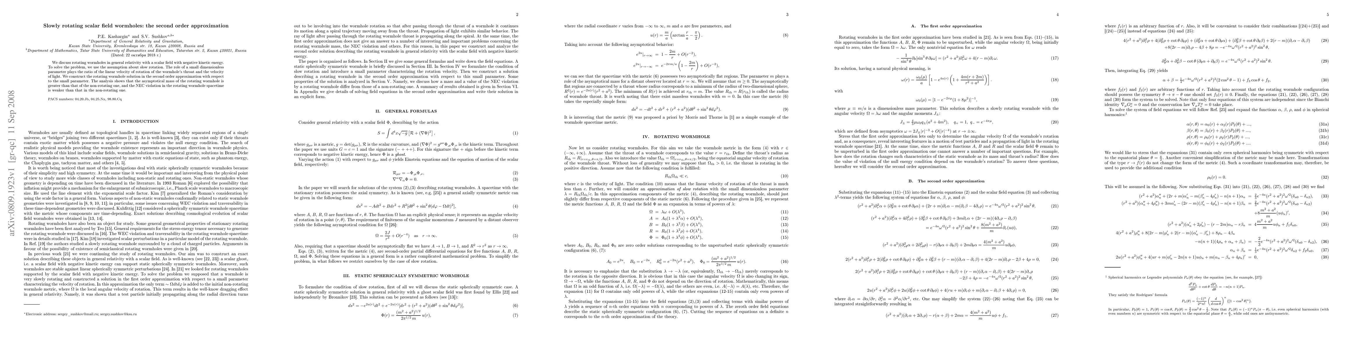 This paper explores rotating wormholes in general relativity driven by a scalar field with negative kinetic energy, assuming slow rotation. It constructs a solution in the second-order approximation, revealing that the asymptotic mass of the rotating wormhole is greater than that of a non-rotating one, and the NEC violation is weaker in the rotating case.