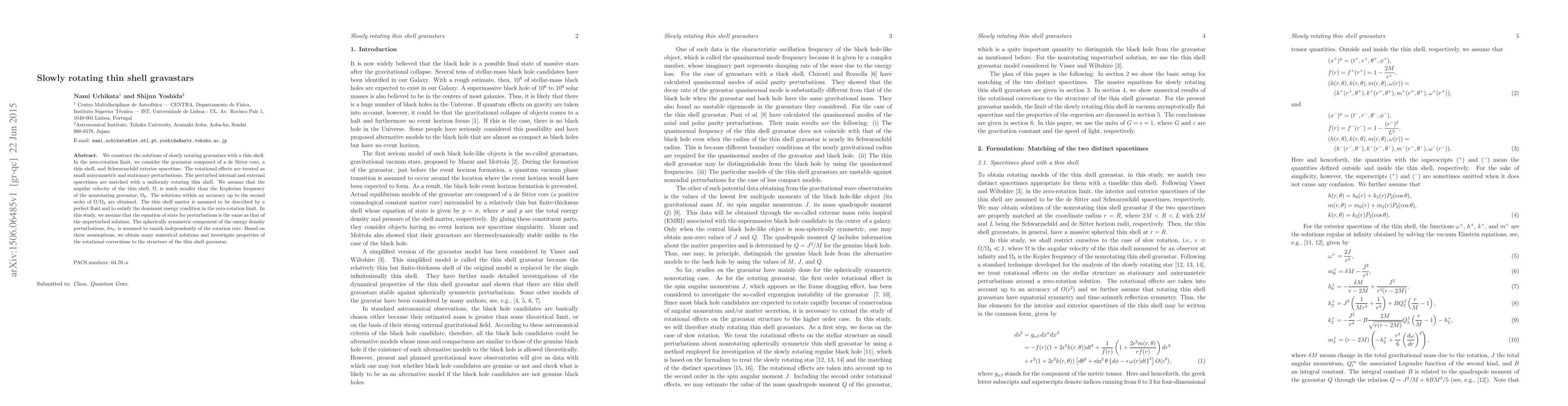 This paper constructs solutions for slowly rotating gravastars with a thin shell, considering small axisymmetric perturbations. It matches perturbed internal and external spacetimes with a uniformly rotating thin shell, focusing on properties of rotational corrections to the structure.