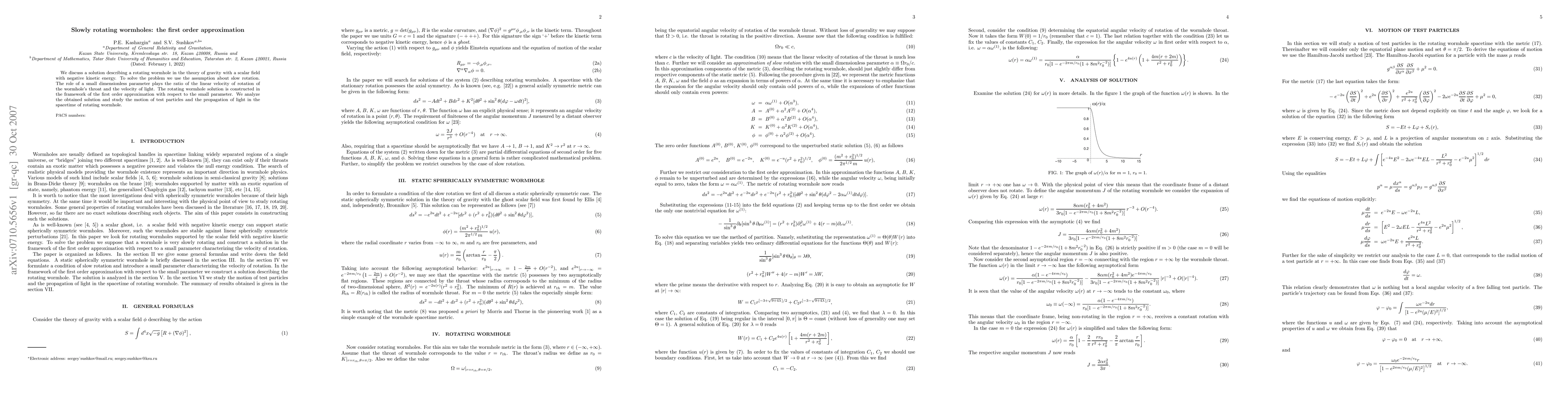 This paper presents a solution for a slowly rotating wormhole in a theory of gravity involving a scalar field with negative kinetic energy, using a first-order approximation based on the small ratio of the wormhole's rotation velocity to the speed of light. It analyzes the behavior of test particles and light propagation in the resulting spacetime.