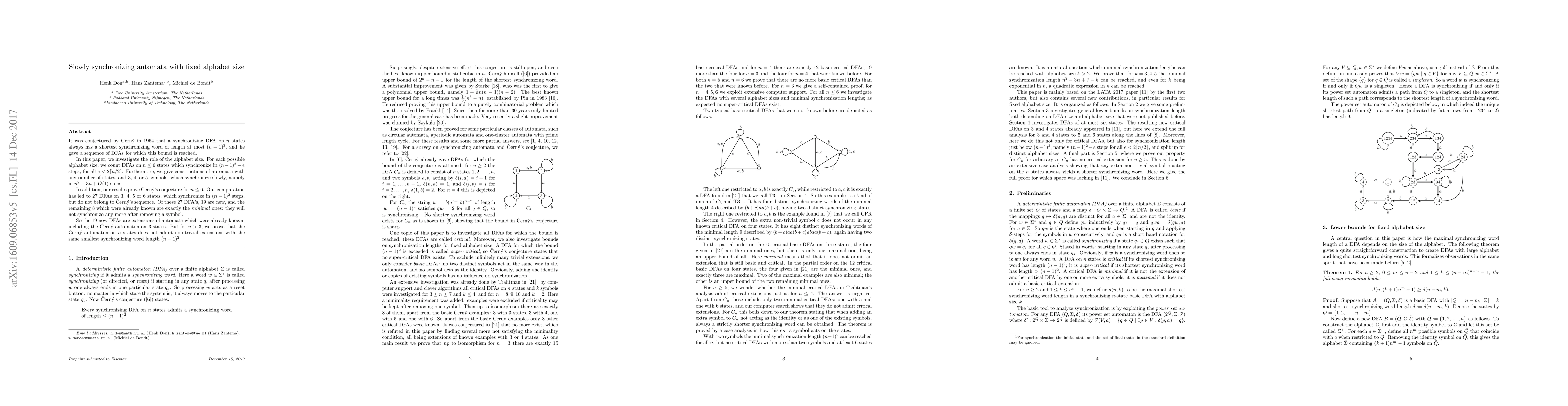This paper investigates the synchronization behavior of DFAs with fixed alphabet sizes, proving Černý's conjecture for DFAs with up to 6 states and constructing new synchronizing automata with 3 to 5 symbols that synchronize in $n^2 - 3n + O(1)$ steps. It also identifies 19 new DFAs that synchronize in $(n-1)^2$ steps, extending known automata but showing no non-trivial extensions for $n > 3$.