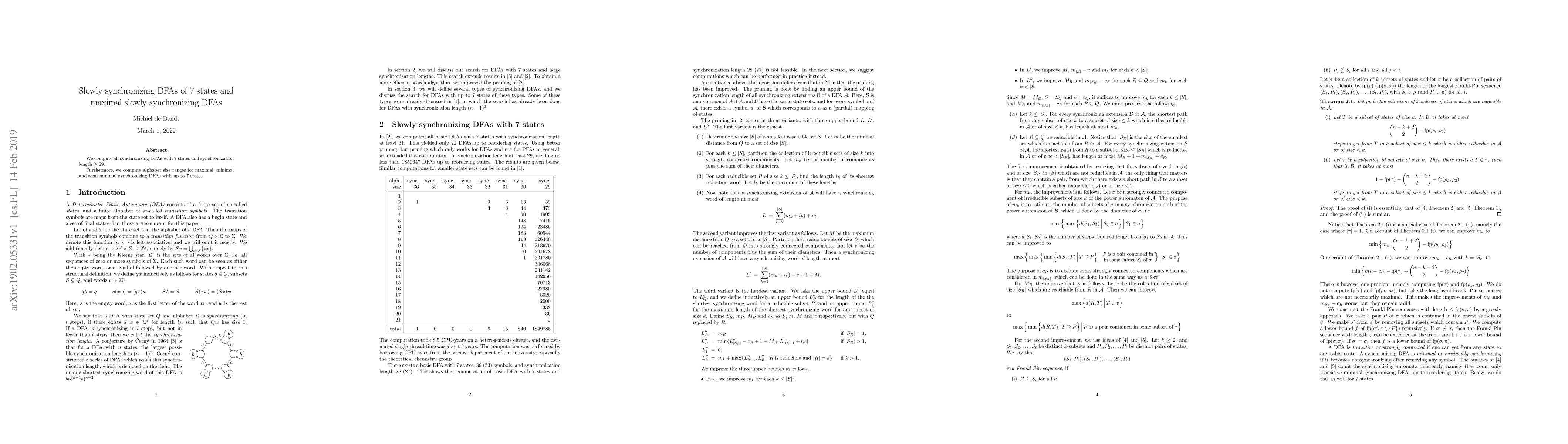 We compute all synchronizing DFAs with 7 states and synchronization length >= 29. Furthermore, we compute alphabet size ranges for maximal, minimal and semi-minimal synchronizing DFAs with up to 7 states.