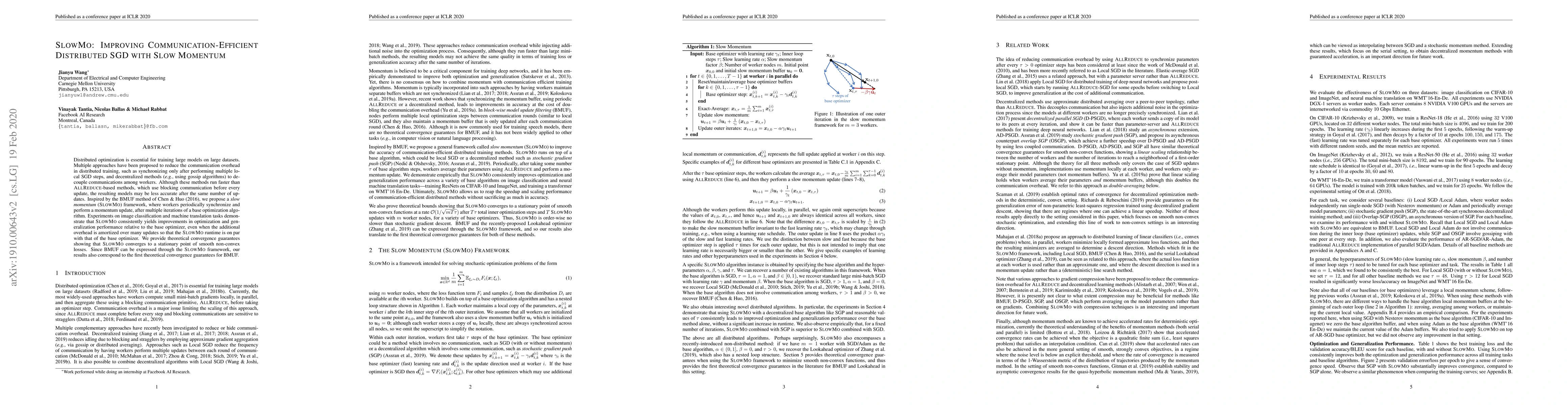 SlowMo improves communication-efficient distributed SGD by periodically synchronizing and performing momentum updates, leading to better optimization and generalization performance compared to base optimizers. Theoretical convergence guarantees show SlowMo converges to a stationary point of smooth non-convex losses.