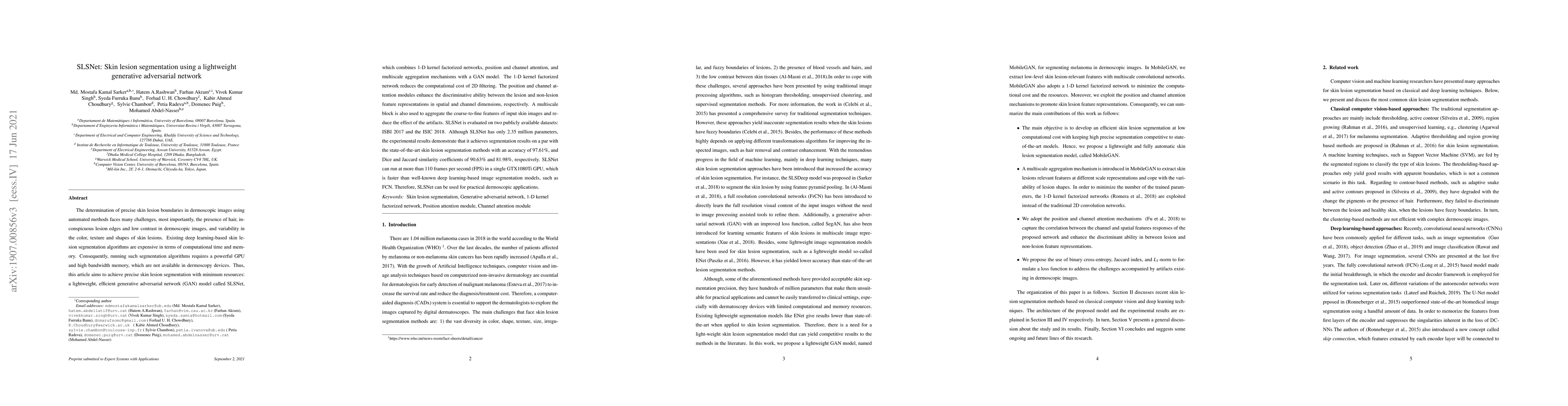 SLSNet is a lightweight generative adversarial network designed for efficient skin lesion segmentation in dermoscopic images, overcoming challenges like hair and low contrast. It achieves high accuracy with minimal computational resources, running at over 110 FPS on a single GPU, making it practical for dermoscopy devices.