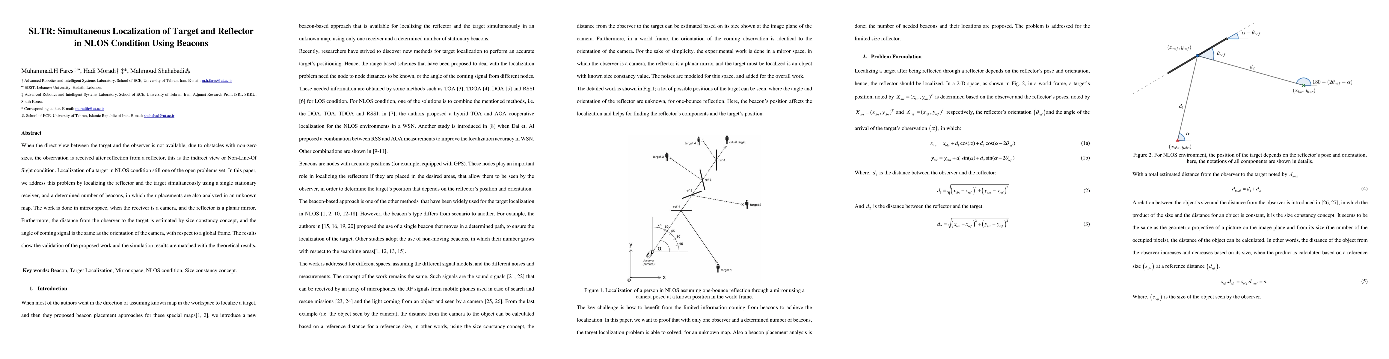 When the direct view between the target and the observer is not available, due to obstacles with non-zero sizes, the observation is received after reflection from a reflector, this is the indirect view or Non-Line-Of Sight condition. Localization of a target in NLOS condition still one of the open problems yet. In this paper, we address this problem by localizing the reflector and the target simultaneously using a single stationary receiver, and a determined number of beacons, in which their placements are also analyzed in an unknown map. The work is done in mirror space, when the receiver is a camera, and the reflector is a planar mirror. Furthermore, the distance from the observer to the target is estimated by size constancy concept, and the angle of coming signal is the same as the orientation of the camera, with respect to a global frame. The results show the validation of the proposed work and the simulation results are matched with the theoretical results.