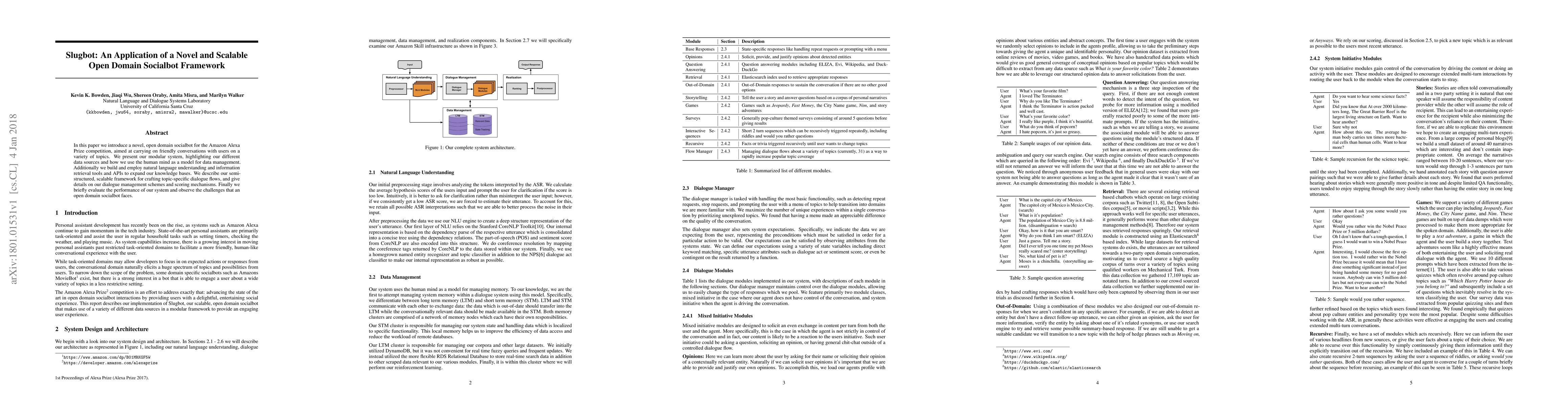 This paper introduces Slugbot, a novel, scalable open domain socialbot designed for the Amazon Alexa Prize competition, featuring a modular system that leverages human cognitive models, natural language understanding, and information retrieval tools to engage in diverse conversations. The paper also outlines its scalable framework for dialogue management and discusses its performance and challenges.