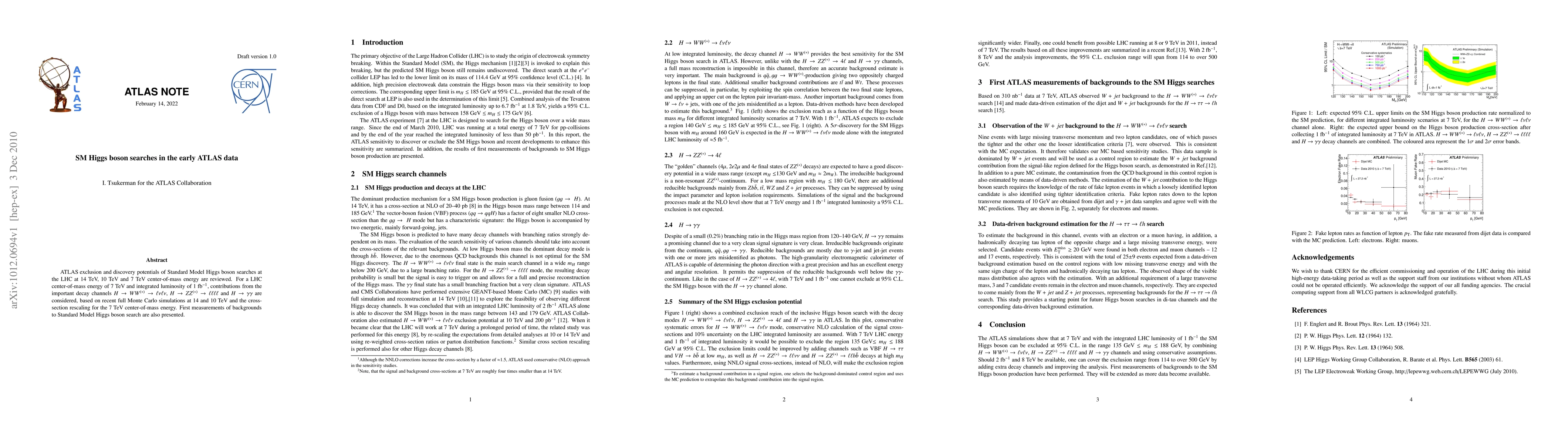 This paper evaluates the ATLAS experiment's capability to discover or exclude the Standard Model Higgs boson in early LHC data at 7 TeV, 10 TeV, and 14 TeV. It highlights the significance of decay channels like H→WW(*), H→ZZ(*), and H→γγ, backed by Monte Carlo simulations. Initial background measurements for SM Higgs boson searches are also reported.